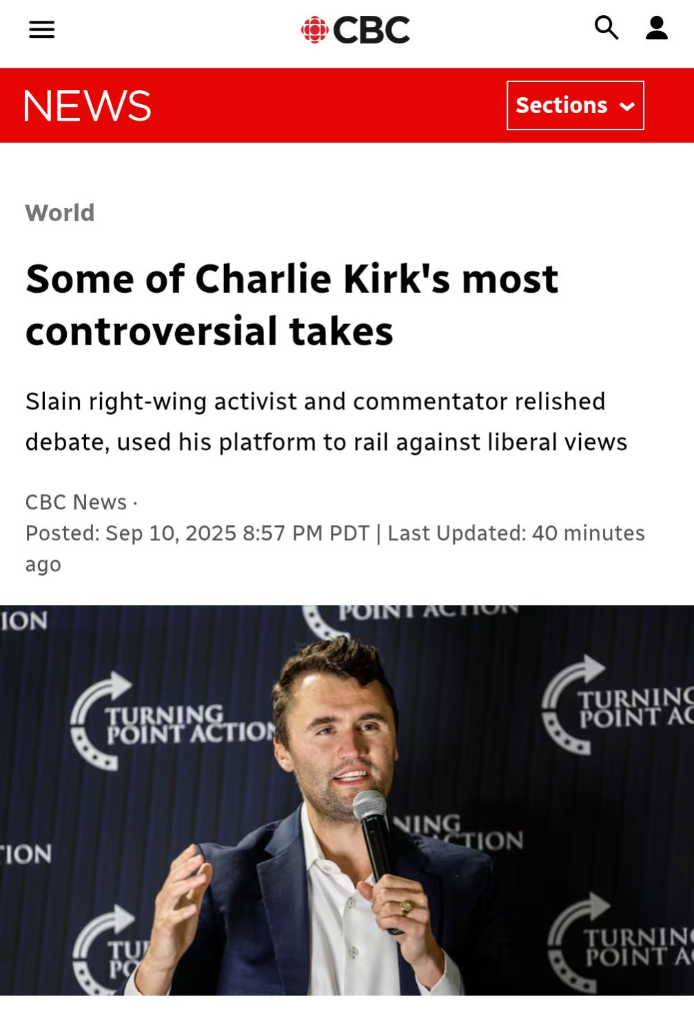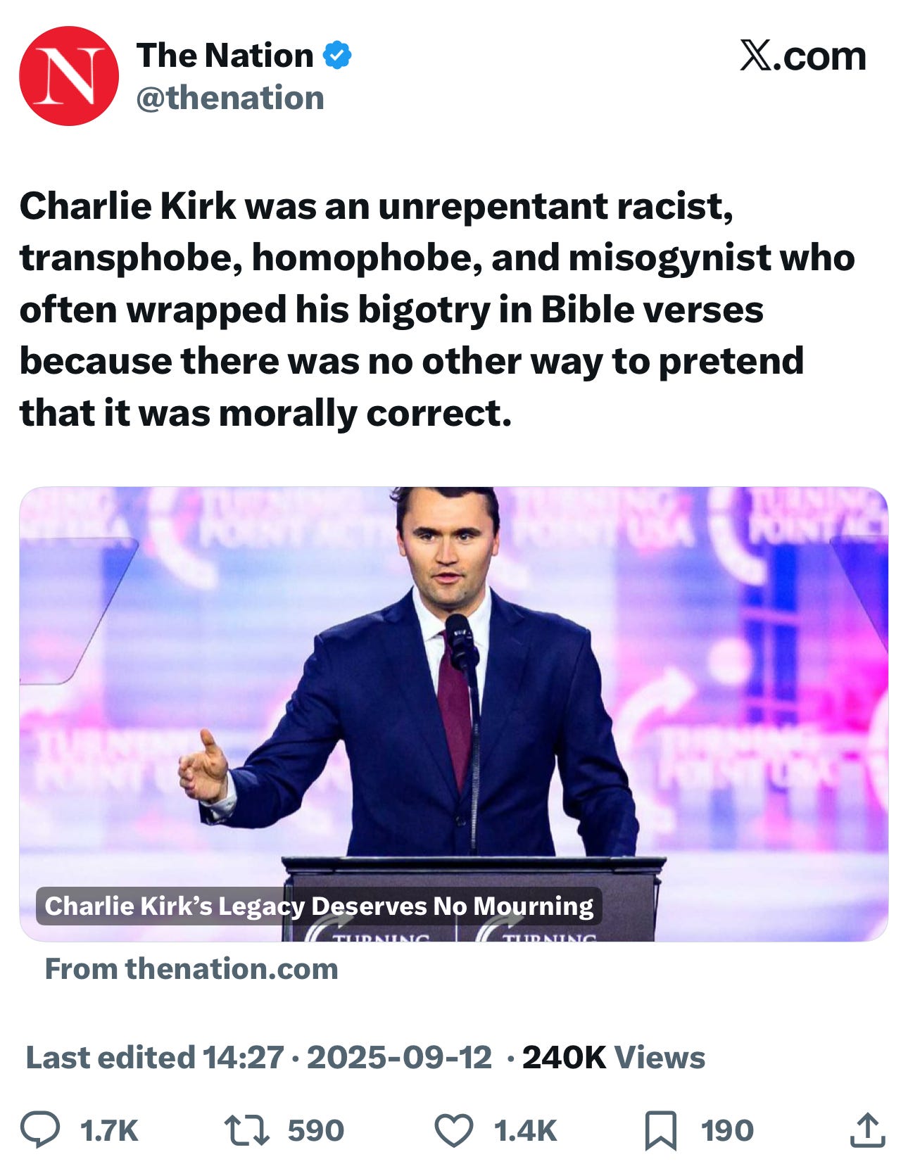 “It is rude of me to say all of this, because we live in a culture where manners are often valued more than truth. That is why a slew of pundits and politicians have raced to portray Kirk’s activities, which harmed many vulnerable people, in a positive light—and to give him the benefit of the doubt that he did not grant to anyone who wasn’t white, Christian, straight, and male.” — Elizabeth Spiers