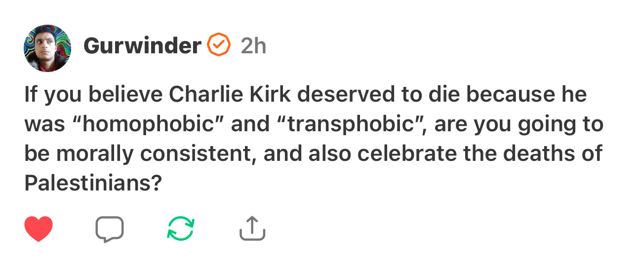 Interestingly, the be-kind cult members now furiously trashing the late Charlie Kirk often happen to support antisemitic Palestinian activism and sometimes even Hamas et al as viable resistance movements. Not sure if they know about the level of sexism, homophobia, transphobia, racism, and general intolerance within the Palestinian society. Perhaps they choose to make an exception because hating Israel means more to them than upholding human tolerance values.