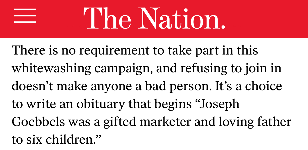 Spiers compares Charlie Kirk to Joseph Goebbels. Again, we can see the insidious nature of dehumanisation creeping in. Monstrification of our political enemy feels very self gratifying, doesn’t it reader? As an aside, do we need to believe Goebbels treated his children in an unloving way to agree he held repugnant and awful views and participated in the mass murder of European Jewry and constructed a powerful propaganda machinery of hate and dehumanisation? I don’t see the reason we need to bring Goebbels’ kids into any discussion about his hateful genocidal behaviour. He and his wife did choose to murder themselves and their six children after the defeat of the Nazis and the suicide death of Hitler in the bunker.