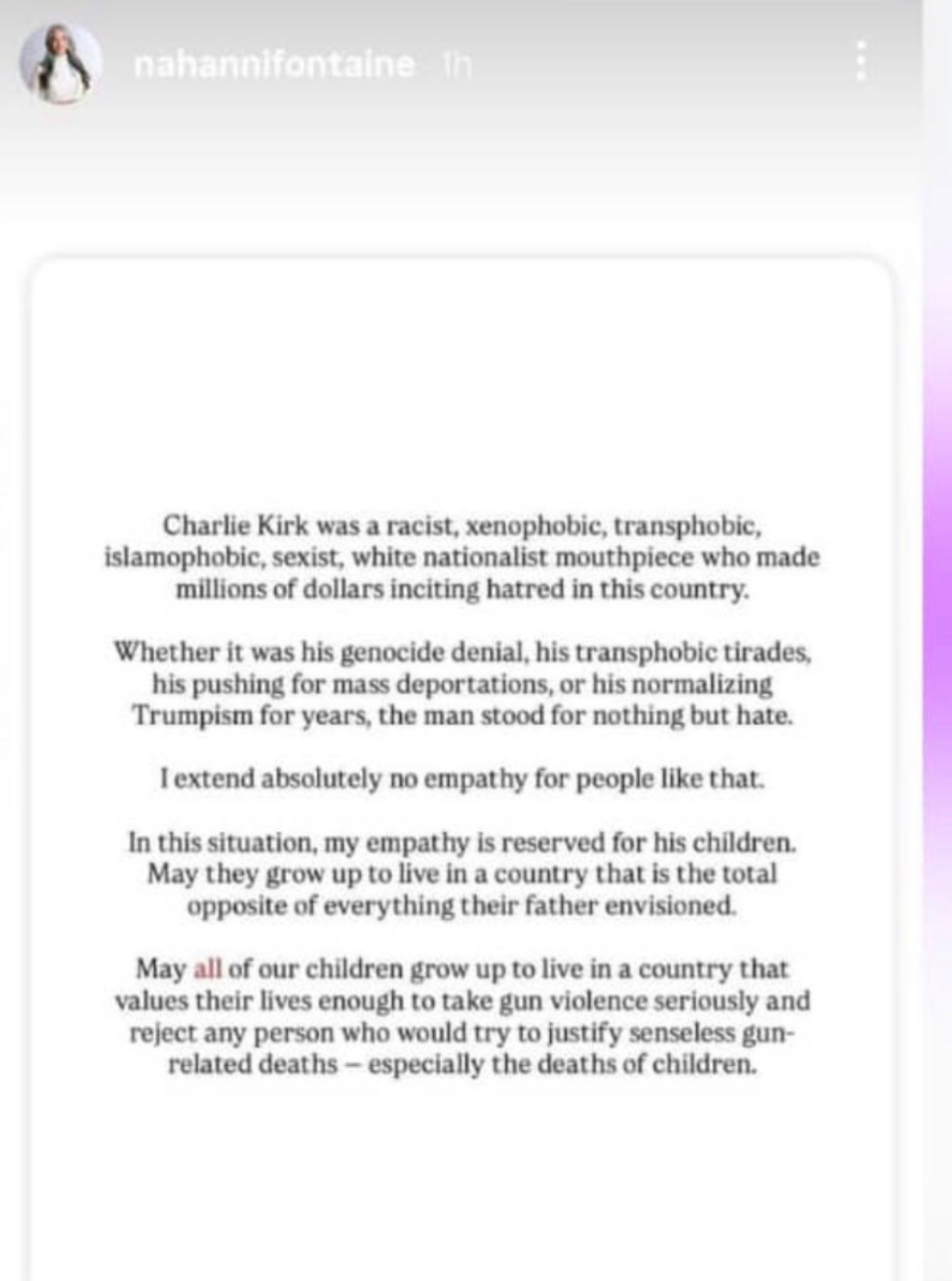 The Manitoba Minister of Families posted this in her Instagram stories, and then erased it. Screenshots last forever, Ms Fontaine. Imagine being a families minister and writing this stuff.