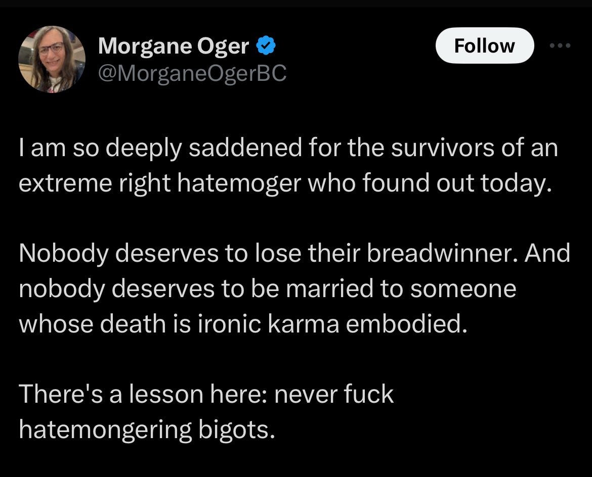 “He was an unrepentant racist, transphobe, homophobe, and misogynist who often wrapped his bigotry in Bible verses because there was no other way to pretend that it was morally correct. He had children, as do many vile people.” — Elizabeth Spiers