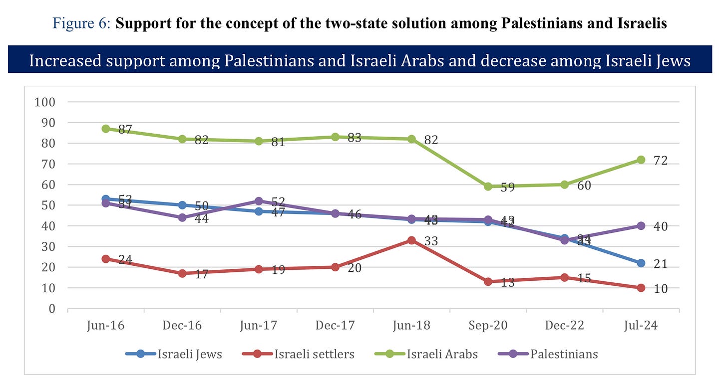 Hereās a graph showing the support for a two state solution, dated July 2024, from the Palestinian Centre for Policy and Survey Research. Survey researchers note support linked to low perceived feasibility.