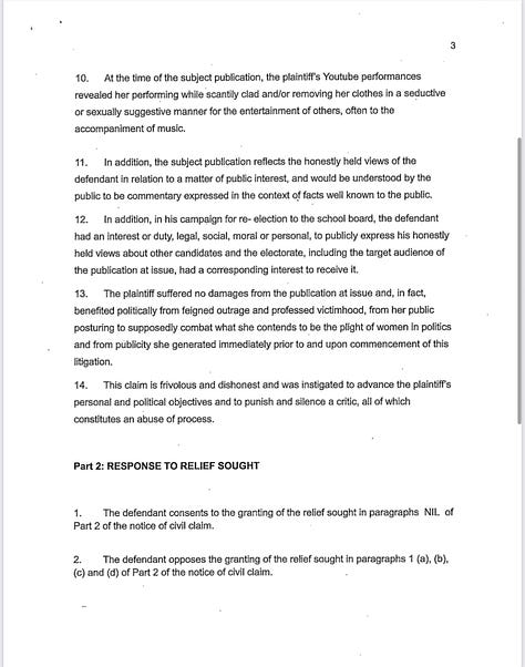 Through her parody of the Miley Cyrus video, didnât Bondar seek to educate her students on the science of evolution whilst challenging societal norms imposed on female people regarding their bodies and the sexual liberties afforded them by the overall culture in which we find ourselves? If so, I would think Bondar would embrace the views of any socially conservative critics who expressed an opinion she found regrettable, wouldnât you, reader? It would seem like a delicious opportunity, and maybe even an obligation based on her self-described ethic to de-stigmatise, for Bondar to flip commentary she received as criticism on its head and make it her opportunity for publicity. Just as Neufeld felt it necessary, as a school trustee, to follow through with his ethic and do his duty âlegal, social, moral or personal, to publicly express his honestly held views about other candidates and the electorate, including the target audience of the publication at issue âŚâ (Response to Notice of Civil Claim, p. 3).