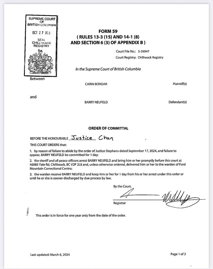 Barry Neufeld (02:21) :: There is a warrant for my arrest that the sheriffs are in possession of. Theyâve had it for over two weeks. They havenât acted on it. itâs a weirdly worded. It says that Iâm supposed to serve one day in Ford Mountain Correctional Centre. Interestingly enough, was delivered to court today by a correctional officer from Ford Mountain Camp. I was a probation officer. I was an officer of this court for many years. I visited Ford Mountain many times to interview inmates. so this probably Carin Bondar thinks is her greatest triumph.