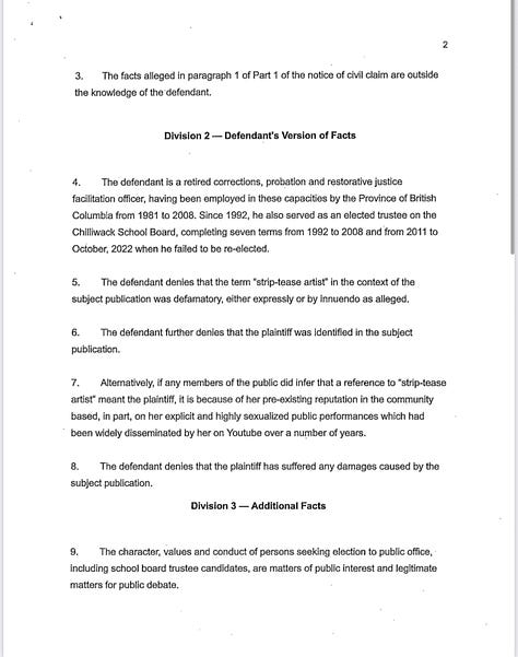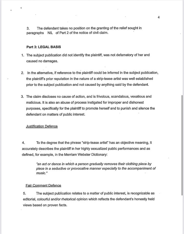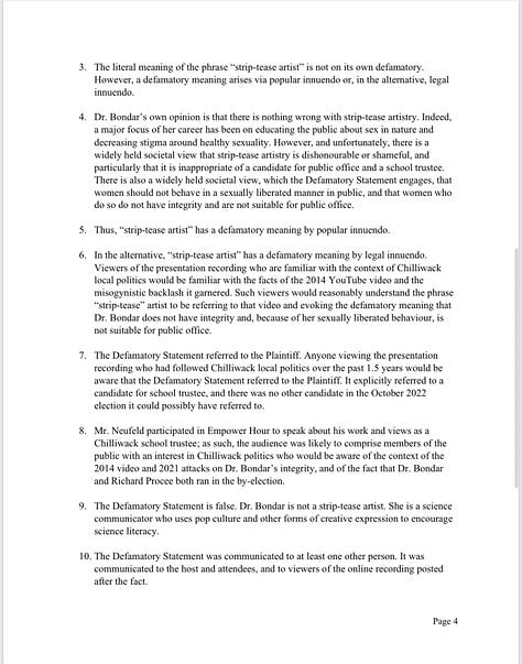 In the alternative, âstrip-tease artistâ has a defamatory meaning by legal innuendo. Viewers of the presentation recording who are familiar with the context of Chilliwack local politics would be familiar with the facts of the 2014 YouTube video and the misogynistic backlash it garnered. Such viewers would reasonably understand the phrase âstrip-teaseâ artist to be referring to that video and evoking the defamatory meaning that Dr. Bondar does not have integrity and, because of her sexually liberated behaviour, is not suitable for public office. (Notice of Civil Claim, p. 4)