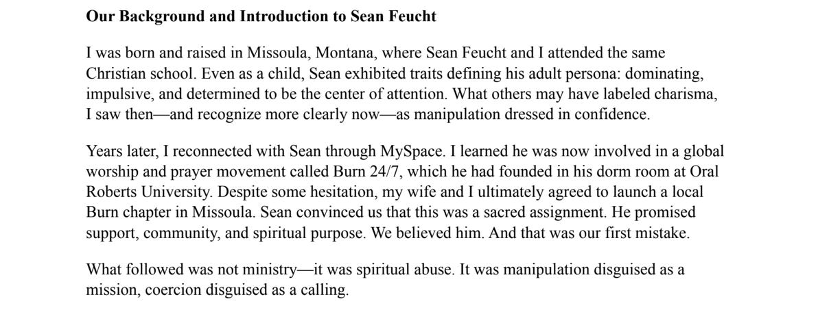 “Beyond the financial allegations detailed elsewhere in this report, multiple former staff, volunteers, and ministry partners have come forward with accounts of spiritual, emotional, and psychological abuse experienced while working with Sean Feucht and his organizations. These testimonies reveal consistent patterns of manipulation, exploitation, and harmful leadership practices that have caused significant personal damage to those involved.” —via Spiritual, Emotional & Psychological Abuse :: Research Report: Sean Feucht's Ministries