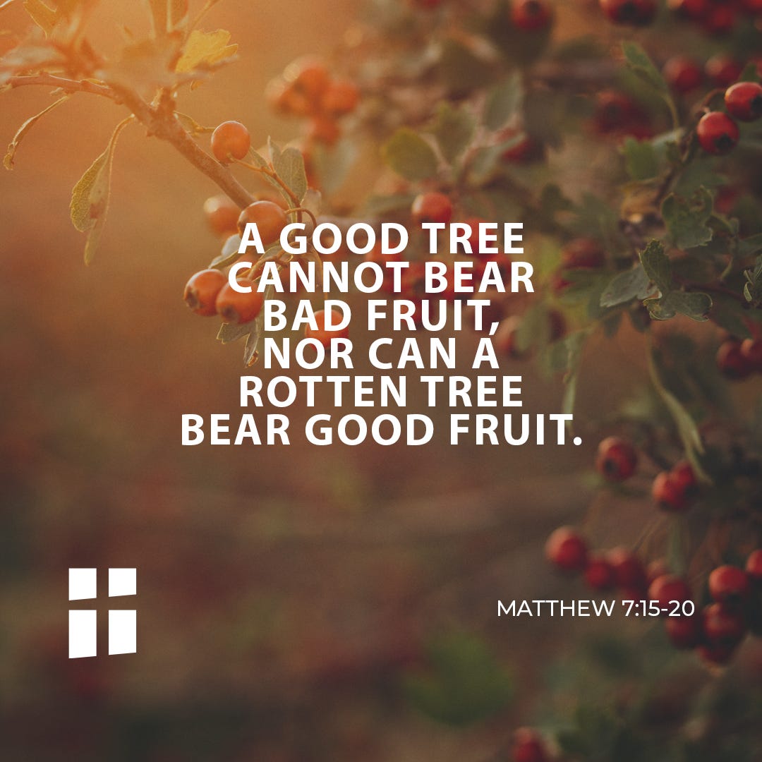 15 “Beware of false prophets, who come to you in sheep's clothing but inwardly are ravenous wolves.16 You will recognize them by their fruits. Are grapes gathered from thornbushes, or figs from thistles? 17 So, every healthy tree bears good fruit, but the diseased tree bears bad fruit. 18 A healthy tree cannot bear bad fruit, nor can a diseased tree bear good fruit. 19 Every tree that does not bear good fruit is cut down and thrown into the fire.20 Thus you will recognize them by their fruits.