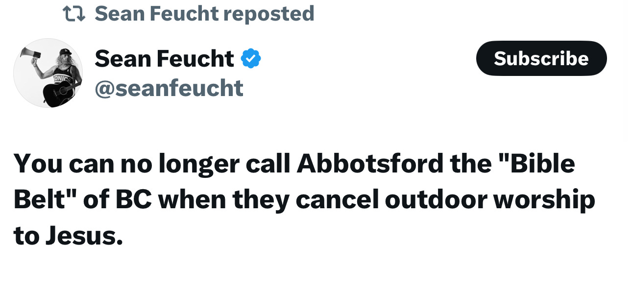 Sean Feucht has created a problem to divide people. He plays his guitar and sings whilst Canada burns itself to destruction in a silly political civil war. How much attention and material profit does he rake in from the religious war he started and continues to fuel?