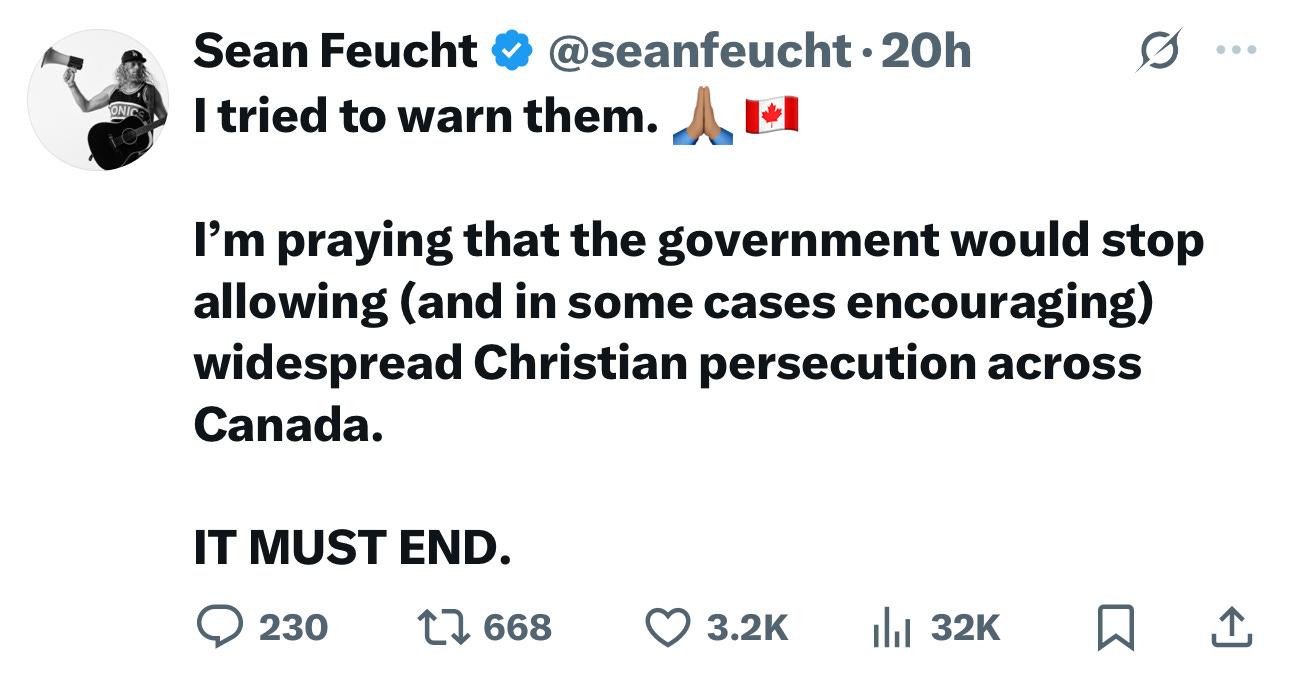 Sean Feucht now enjoys free publicity from the false holy war he has tried to trigger in Canada. He preyed on and exploited a weakness in Canadian discourse and society—he continues to ride it for all he can get.