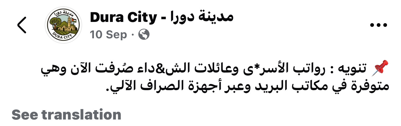 A September 10, 2025 post on the Facebook page of Dura Municipality featured a similar deliberate distortion of the words “prisoners” and “martyrs”. It said: “Reminder: the salaries of the prisone*rs and the families of the m&rtyrs are currently being paid and are available at the post offices and ATMs.”