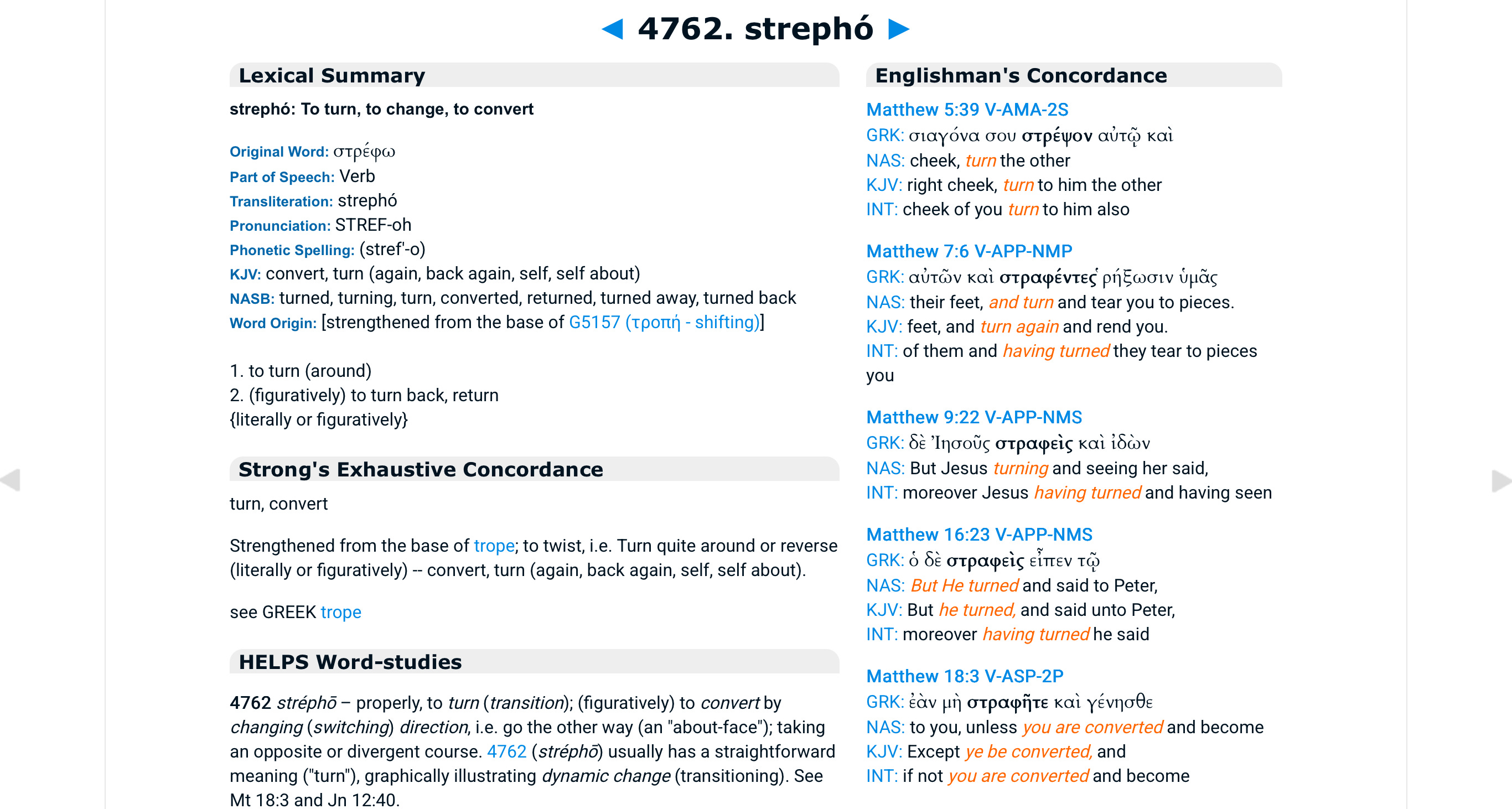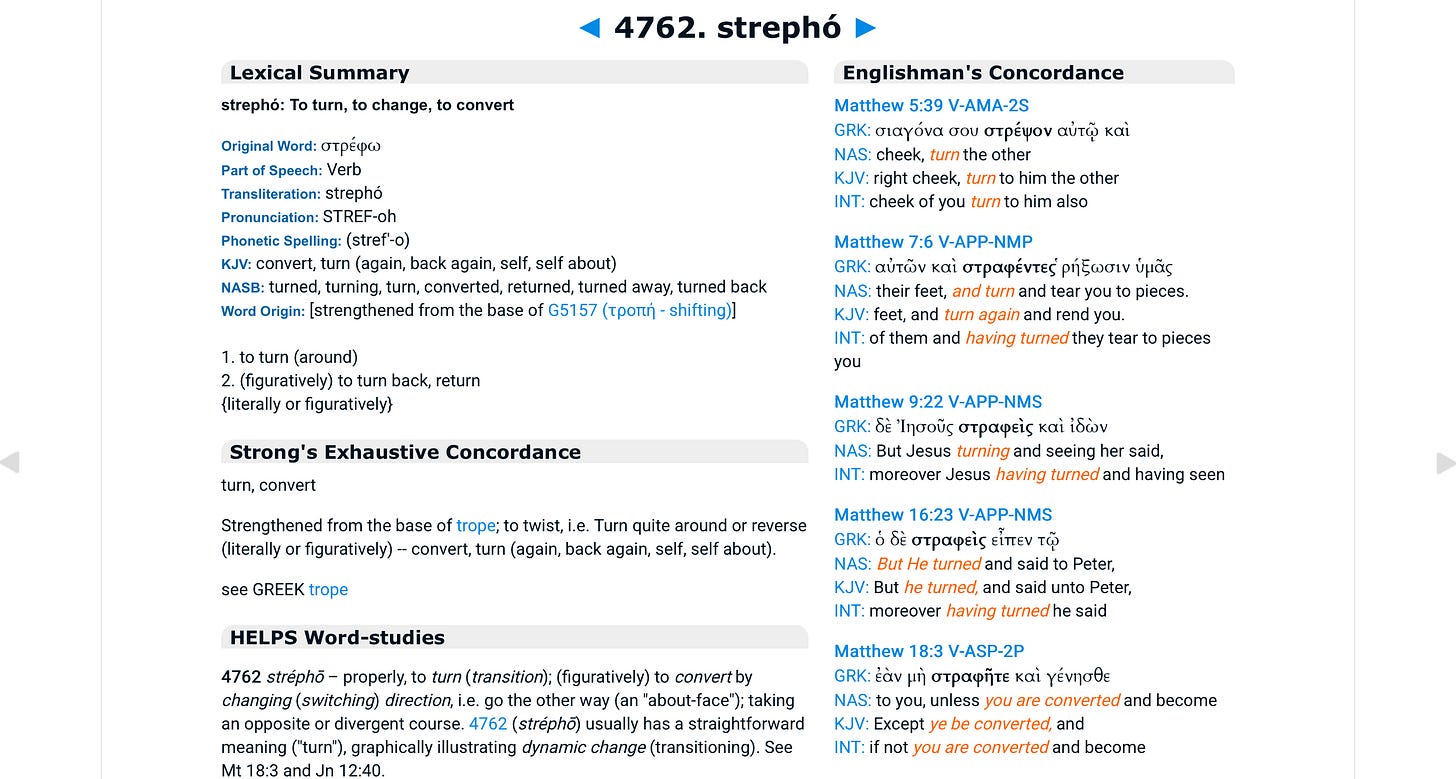 Pastor Heechan reminds us of the Greek word used in line three, στραφῆτε (straphēte). Above I’ve provided a screenshot of the concordance entry on the root word, stréphō. You can see what Jesus calls us to do — turn toward G-d, do an about-face, take a divergent path from our worldly egocentric approach. Jesus calls us to engage a radical transformation, turn from the old self and toward a new Jesus way of being a better person.