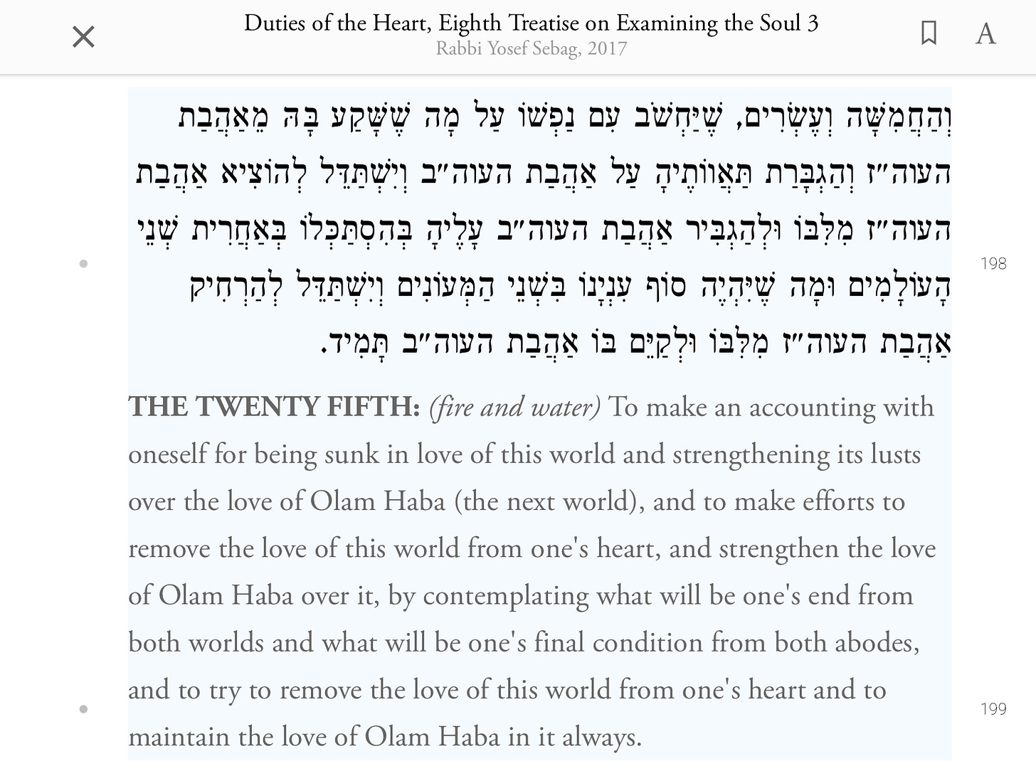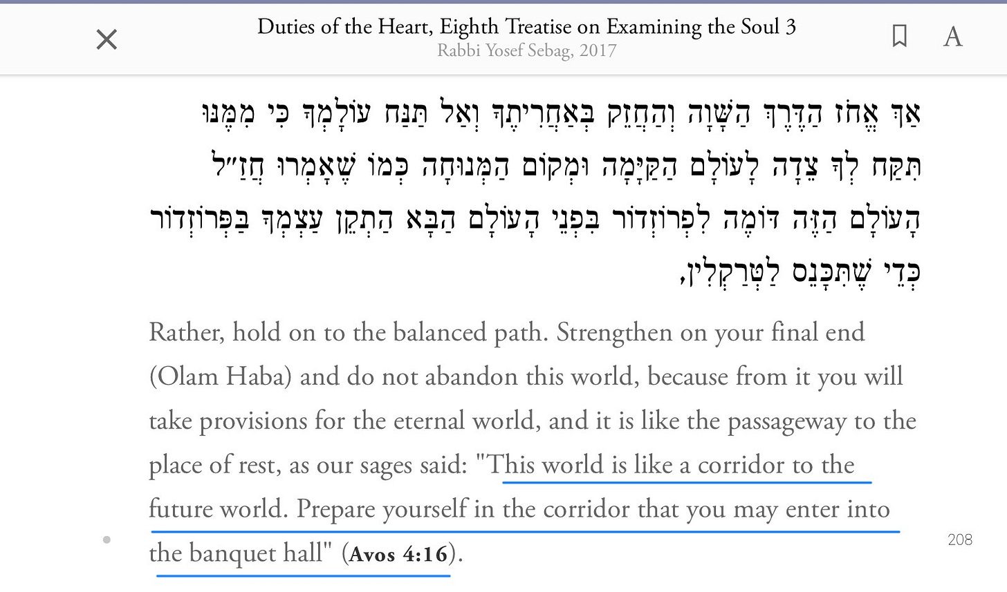 So, reader, the lessons from Duties of the Heart fits well with this lesson of turning away from selfish ambition. How can you think anything of yourself when you trek through an old growth forest? Or an alpine trail? We truly see and feel our nothingness in the face of the Alps or the Coastal Mountains or the Rocky Mountains, don’t we? This is what ibn Paquda means by treating this world as an antechamber for the eternal life with G-d.