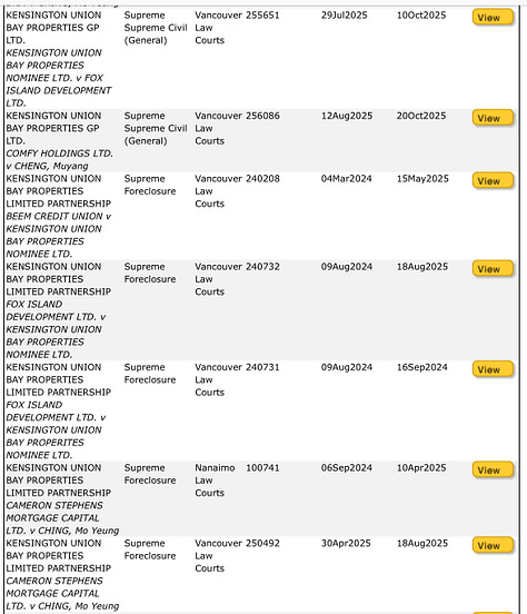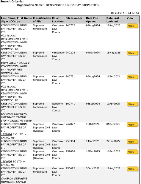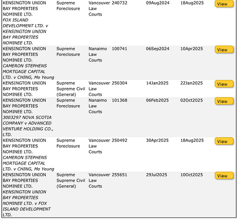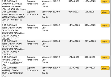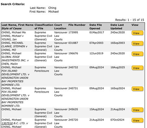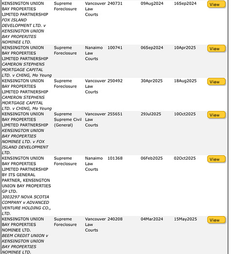 In July of this year CHEK News reported on the listing (for sale) of the Union Bay property, noting that the foreclosure, receivership, and sale complicate plans for a sewer extension promised to the community. The resident quoted in the CHEK article, Kathy Calder, has an X account in which she expresses a great deal of disappointment and frustration at Michael Ching for failing to deliver on the much anticipated development project; if you search Calder’s profile for Michael Ching, you can see how the tolerance of financial recklessness and corruption in BC, and in Canada generally, has devastated people’s lives by exploiting communities.