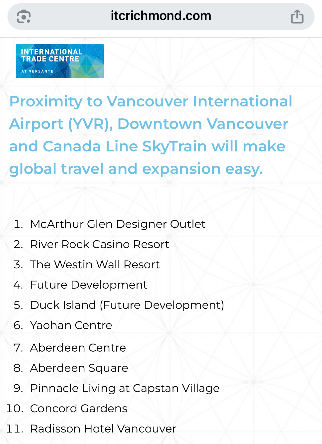 A weird thing I noticed is that Duck Island (Future Development) is listed on the International Trade Centre website. The Versante portion of ITC, a project of Michael Ching, has been under receivership. The Duck Island development refers to the site of the Richmond Night Market. Duck Island seems like a long suffering plan that’s not really gotten off the ground, despite all the spiffy fancy plans promised to the public over the years. The Jingon International Development Group planned a huge waterfront development in Richmond at Duck Island on River Road. No association with Michael Ching, just a sharing of a business address. So, I gather that ITC can refer to the business area, aka Airport Business & Technology Park, or the two remaining towers not affected by foreclosure/receivership.