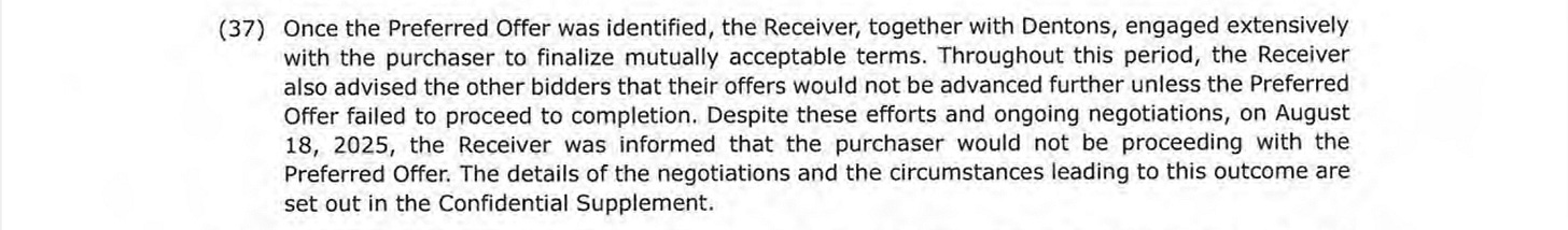 So, let’s back it up and start from the beginning—the Cowichan ruling giving the Ontario based potential buyer cold feet. The third receiver’s report mentions the potential buyer pulling out and doesn’t give a reason or any other details about the buyer.