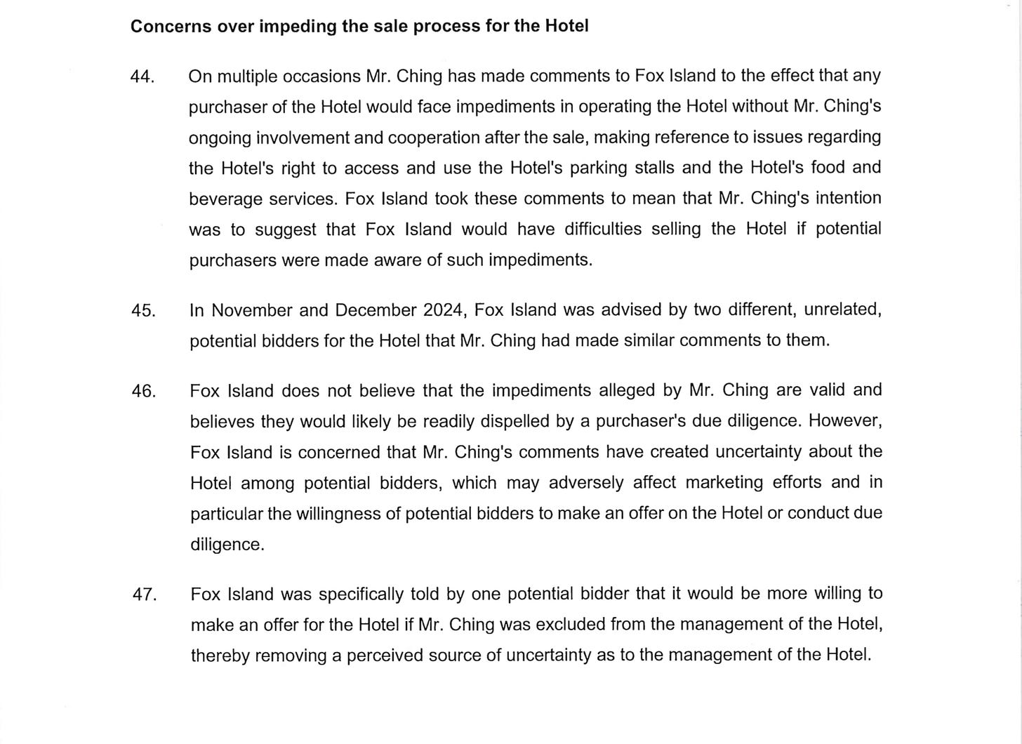 Fox Island understands that: Mr. Ching and his own personal team, and not the Hotel Manager, have full and complete control over the Hotel’s financial operations, including exclusive access to all of the Hotel’s bank accounts; all accounts payable and tax remittances are handled by Mr. Ching and his personal team; and the Hotel Manager’s financial role is limited to presenting bills received by it to Mr. Ching and his personal team for handling.” (para 42 and 43, Notice of Application, February 25, 2025)