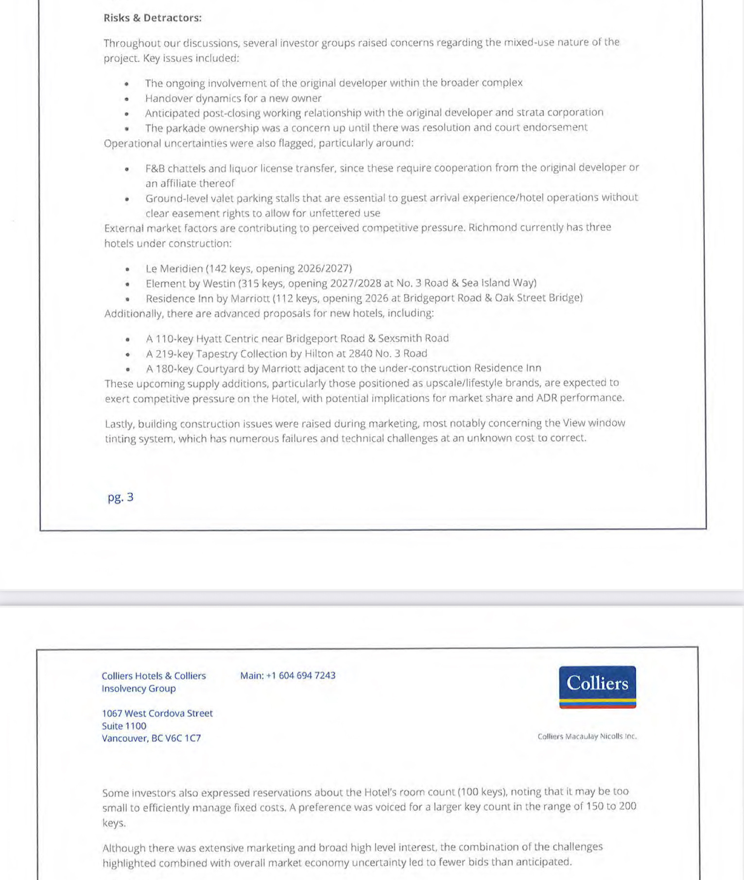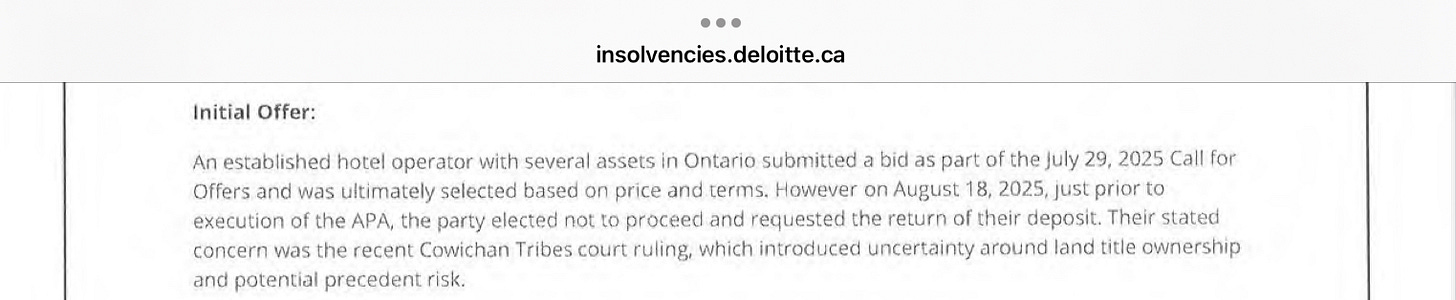Appendix B of the report contains a letter from Colliers, which mentions the potential buyer who got cold feet. Just before the Asset Purchase Agreement became final, a full 11 days after the British Columbia Supreme Court released the ruling Cowichan Tribes v. Canada (Attorney General), 2025 BCSC 1490, the buyer pulled out. Remember Versante Hotel doesn’t overlap with the court ordered title area. How much impulsive and hyperbolic reaction about uncertainty of this ruling created more uncertainty? Humans have a mimetic nature, I’ve written about that at length in this publication.