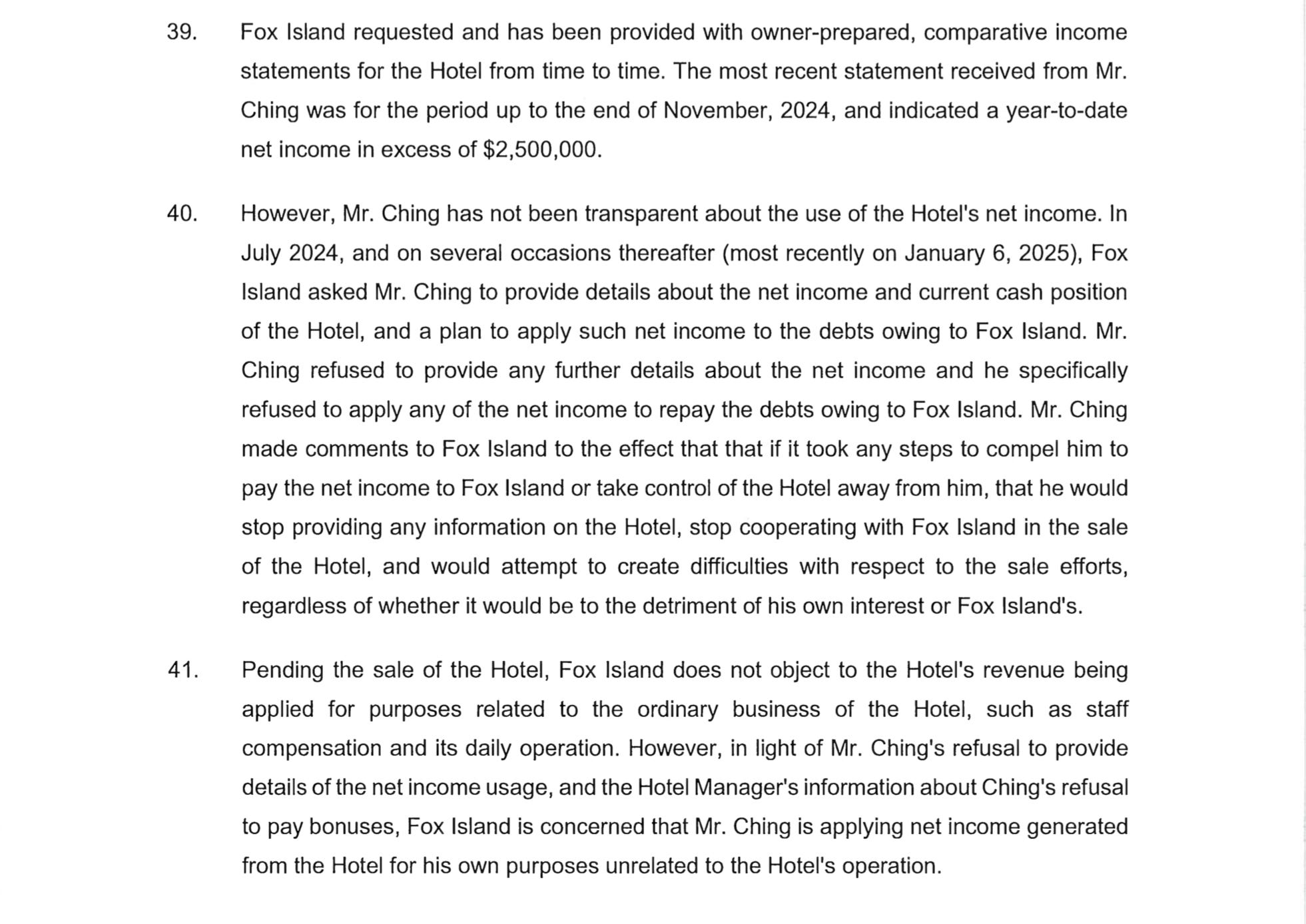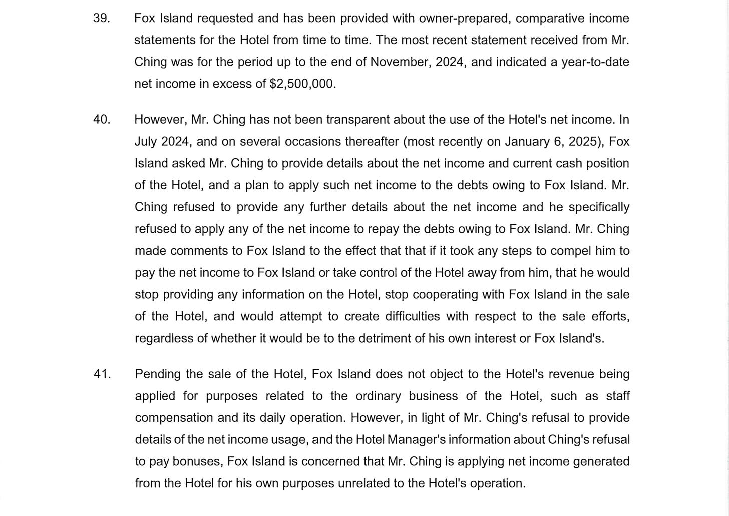 Ching had failed to report financials transparently, leading lenders to conclude that Ching had been applying hotel funds to his meet his own financial shortfall, as Wen Yong Wang writes in his affidavit, “in light of Mr. Ching’s refusal to provide details of the net income usage, and the Hotel Manager’s information about Ching’s refusal to pay bonuses, I am concerned that Mr. Ching is applying net income generated from the Hotel for his own purposes unrelated to the Hotel’s operation,” (para 22, Wen Yong Wang affidavit, February 25, 2025).