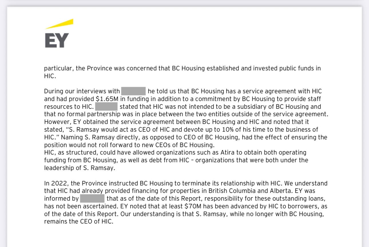 Shayne Ramsay functioned as the CEO of BC Housing, while his wife Janice Abbot, functioned as CEO of Atira, the largest nonprofit housing provider in BC. Ramsay over-involved himself in BC Housing dealings that related to Atira. Atira received preferential treatment and its funding from BC Housing rose over a period of years. Atira’s for-profit arm has an affiliation with CIRES, a property management social enterprise. Atira received many direct awarded contracts from BC Housing. Ramsay and Abbot advocated for CIRES to receive property management contracts. Ramsay funnelled millions of dollars of BC Housing funds into a federally incorporated private lending company he founded with the Ontario and Manitoba housing crown corporations, assisted by the federal government through its housing slush fund. No record of any consultation or approval for the public investment into a private company exists according to the province of BC. Ramsay also committed BC Housing staff to the private lending company. By the time the province of BC discovered the arrangement between BC Housing and HIC, HIC had advanced $70 million to its borrowers. Ernst and Young could not ascertain responsibility for these outstanding loans, earmarked for housing projects in Edmonton and Vancouver.