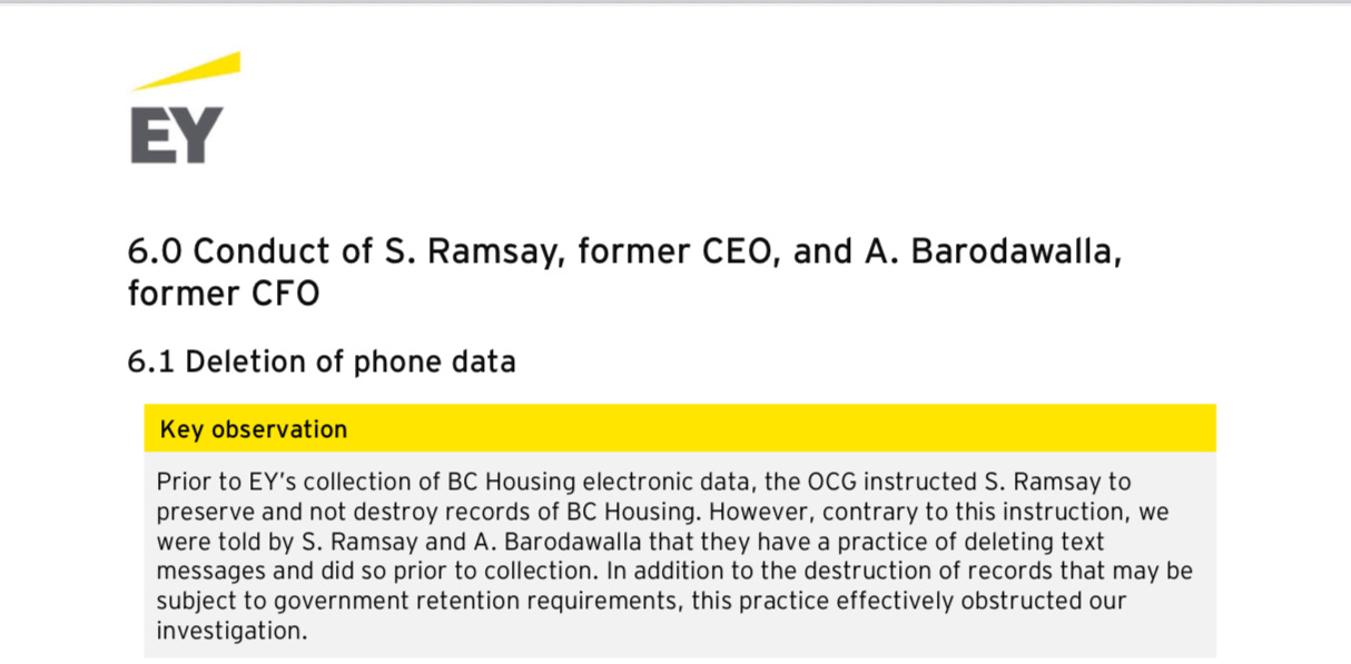 Shayne Ramsay and CFO Abbas Barodawalla obstructed the investigation by deleting their mobile phone text messages after being informed about the forensic audit and receiving instructions not to delete or destroy any correspondence.