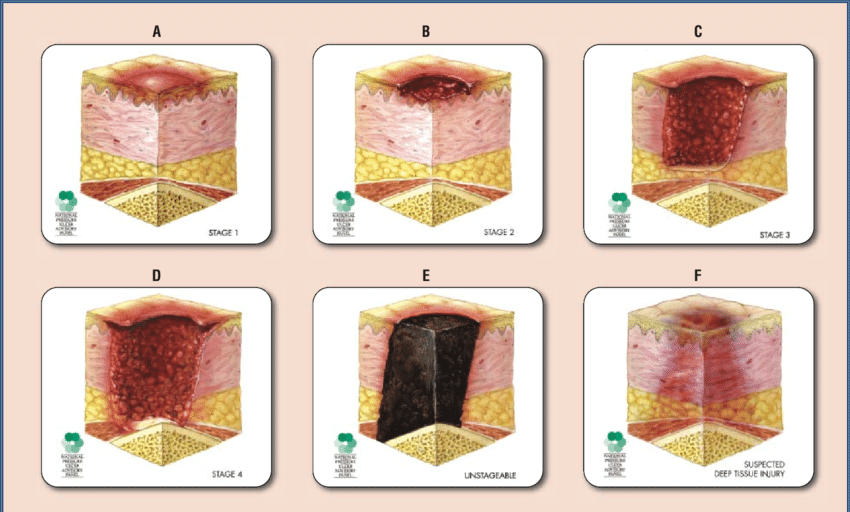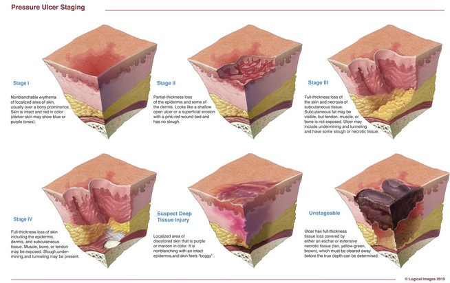 Consider wound care, reader. Below you can see a two diagrams depicting the stages of pressure sores. The image with the dark tissue depicts eschar, it’s a late stage wound, it’s denoted as unstageable.