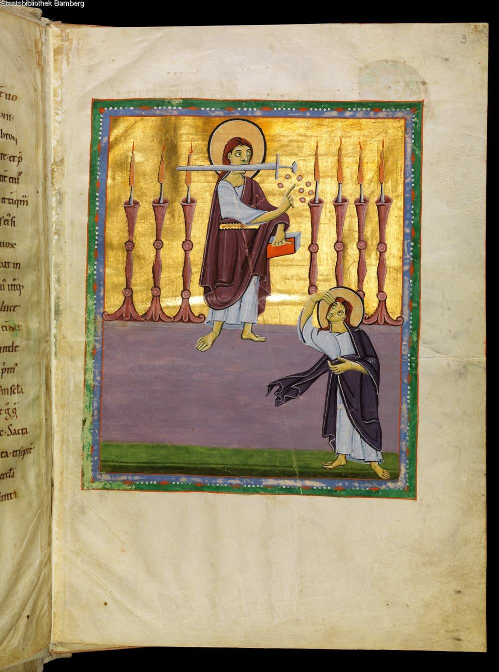 Artwork :: The Son of Man and the seven lampstands, c. 1000 AD, Bamberger Apokalypse Folio 3 recto, Bamberg, Staatsbibliothek, MS A. II. 42