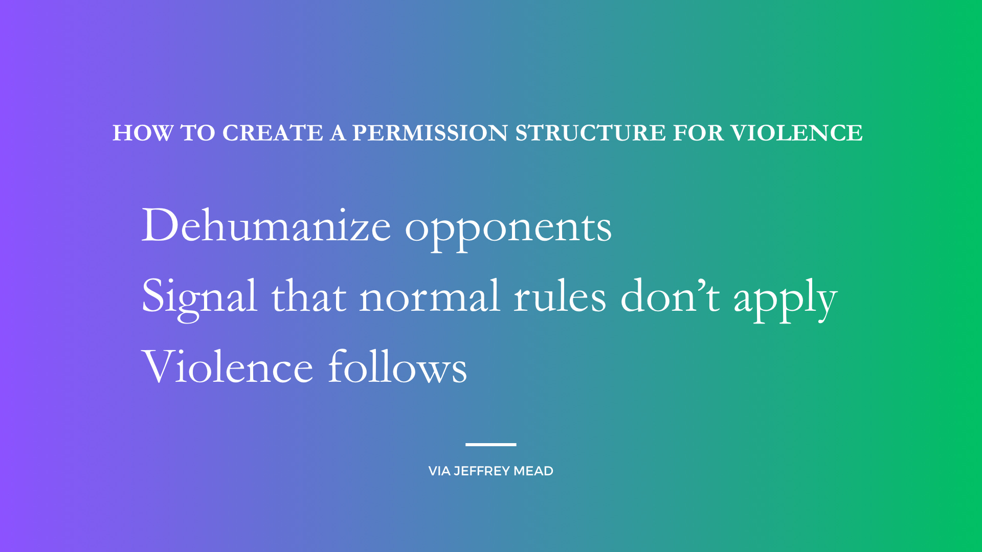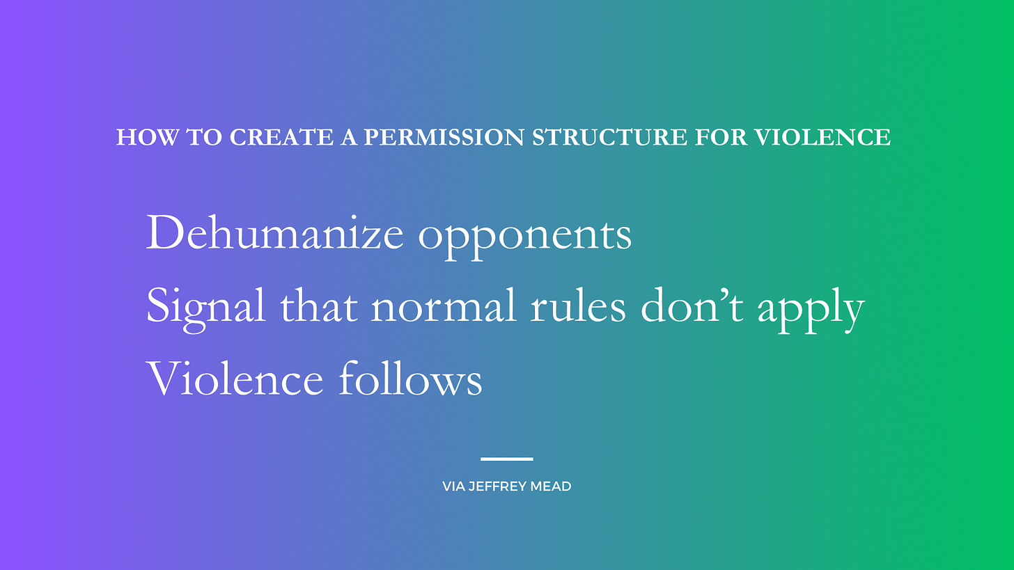 Reader, think about dehumanisation and the insidious way it creeps into discourses to create a permission structure for violence.