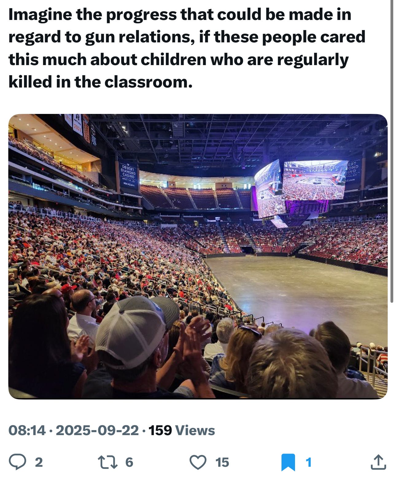 It tells me that anyone grieving for Charlie Kirk and supporting his family and friends and other loved ones as they come to terms with his murder doesn’t care about gun violence in classrooms that harms and kills children.