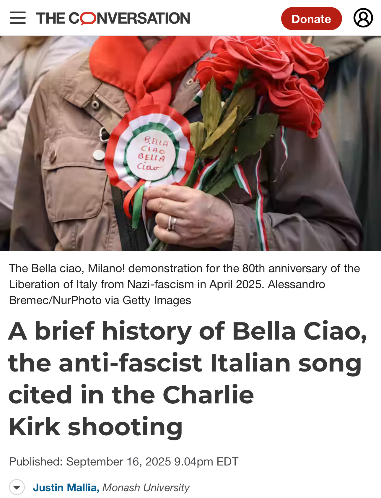 Bella Ciao refers to an Italian folk song associated with the celebration of the end of Mussolini’s dictatorship. So it would seem that Dean Blundell and others who insist that “Charlie Kirk was killed by an ultra MAGA acolyte,” have misinterpreted the situation. In fact, the killer had ties to online gaming culture as well as to the furry community, both dark online cultures associated with an infrastructure of radicalisation.