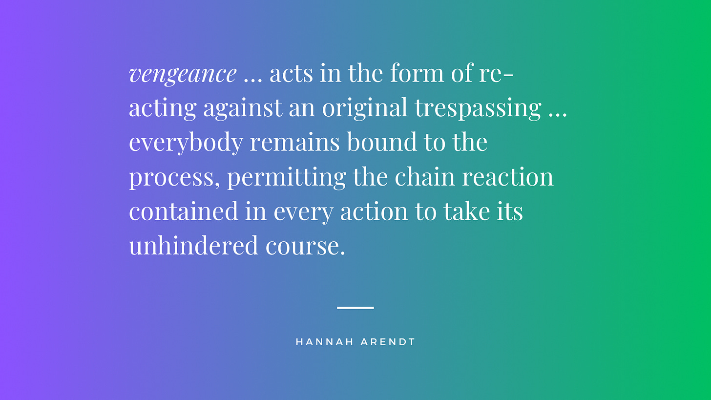 In one of my grad studies courses I’m about to read an excerpt from Hannah Arendt’s On The Human Condition. In this book Arendt writes about the nature of human activity and its connection to political and social life. In the excerpt assigned for my course, Arendt examines Jesus as an important figure in the human activity of forgiveness. She also examines vengeance as limiting in that it binds us all to the offensive or hurtful action.