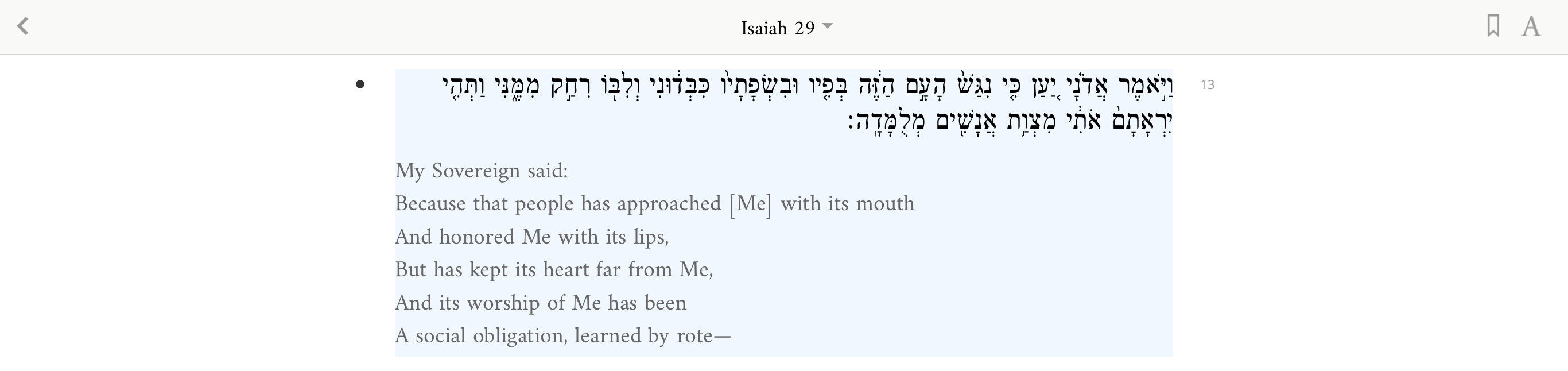 In Duties of the Heart Rabbi Bachya ibn Paquda mentions our Isaiah passage in the Seventh Treatise of Repentance, Third Treatise on Service to G-d, the Fifth Treatise Devotion, and in the Eighth Treatise of Examination of the Soul. Bachya ibn Paquda writes about fearing reprisals from other humans or hoping to derive benefits as opposed to g-d fearing worship. He also writes about such individuals that their disposition inclines them to love of the world and its lusts; and they use the practices of the service of G-d as snares with which to obtain worldly advantages. He further writes they accept the Torah outwardly but not inwardly, with their tongues and not with their hearts. Of such people it is said, “One speaks peaceably to his neighbor with his mouth, but in his heart he waits in ambush for him”, referencing Jeremiah 9:7. Ibn Paquda describes praying with mouth disconnected from heart as akin to disembodiment, like an empty husk of corn. Finally, he writes about such a worshipper, he pleas to G-d with his limbs, but turns from Him in his heart and thoughts.