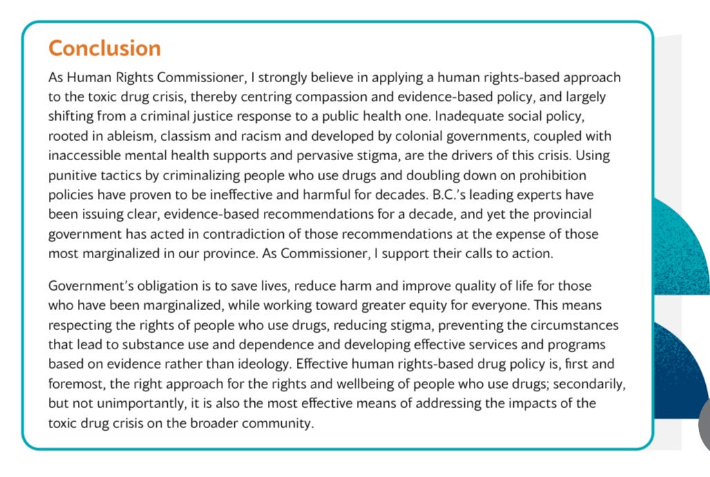 “When public policy on substance use and treatment of people who use drugs is based on stigma and morality, rather than evidence and respect for fundamental human dignity, harmful policies result. The health crisis facing people who use drugs is created by these bad policies, including attempts at drug prohibition … Beyond challenges within the healthcare system, this crisis is also rooted in colonial approaches that prioritize individualism over community, wealth over health and power over empathy.” — Kasari Govender, BC Human Rights Commissioner.