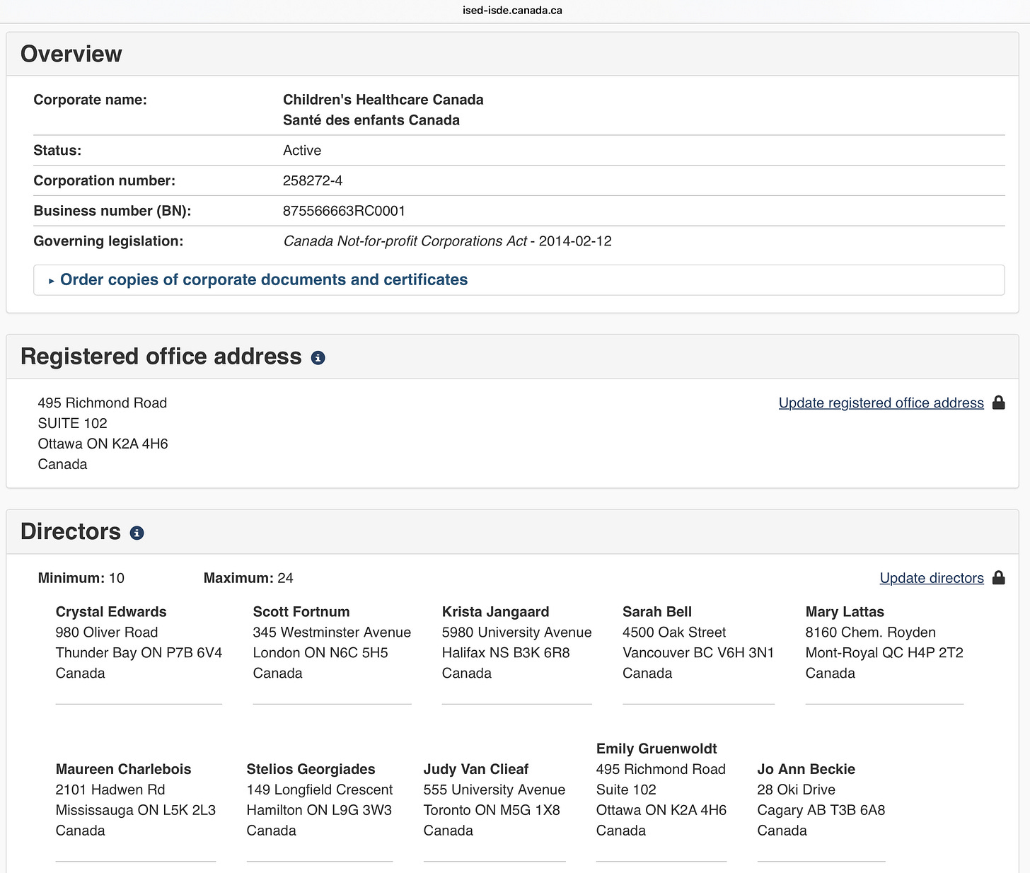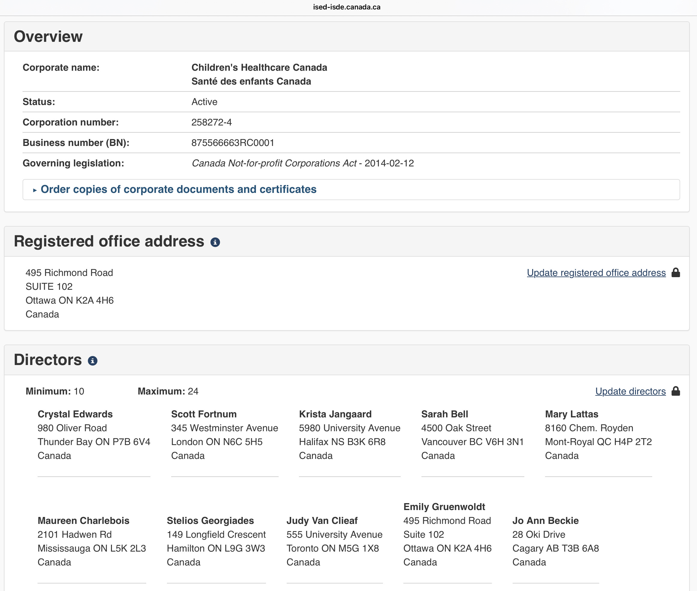 Who funds the CHC? Well, it’s unclear, because the CHC does its best to obfuscate any kind of financial accountability. CHC funding derives from a combination of philanthropic, corporate, and advocacy-driven channels. Whilst it receives no direct operational funding from the Canadian government, it actively lobbies for increased public investments in children’s healthcare. I couldn’t find any financials for the CHC, and the financial statement I could find for the CCHF didn’t reveal much. I found a list of CHC members and patrons here.