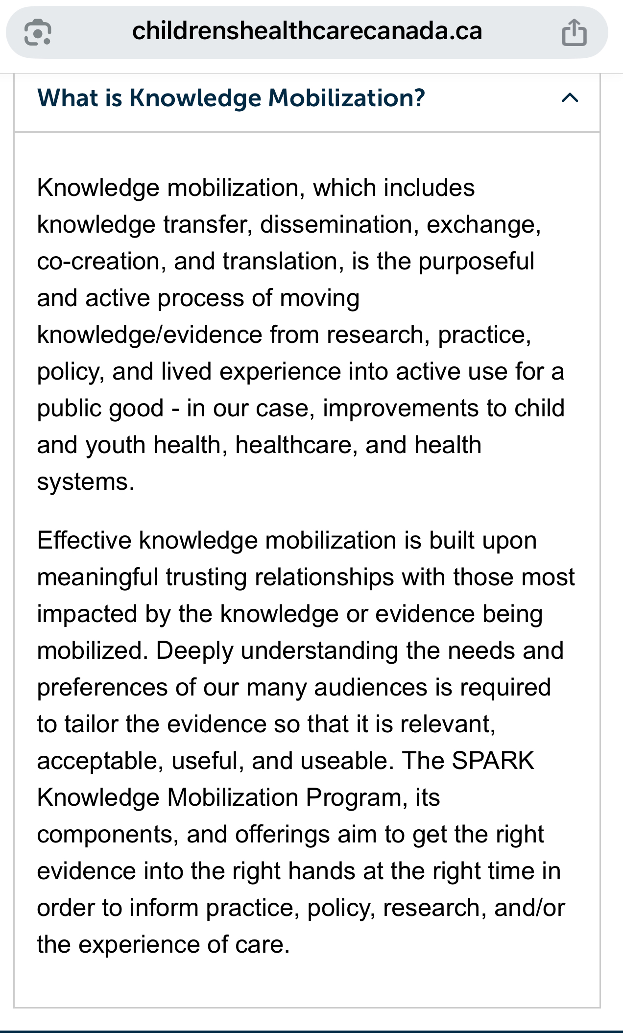 What the heck is knowledge mobilisation, reader? It sounds like an obfuscatory Woko Haram term for propaganda, doesn’t it? According to their website, “Children’s Healthcare Canada’s SPARK Knowledge Mobilization Program aims to curate and showcase knowledge, evidence (from research, practice, policy, and lived experience), and expertise to SPARK conversations, ideas, and action.”