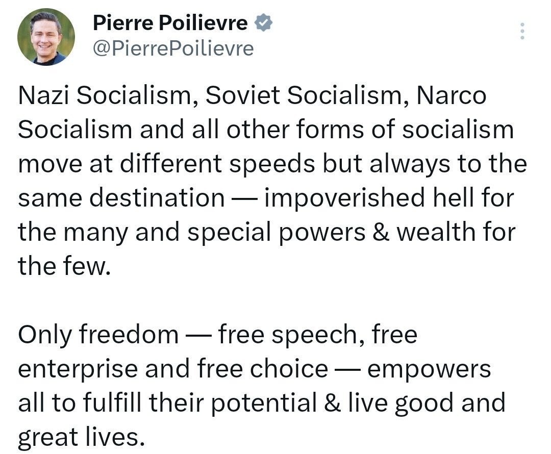 What I like most about Pierre’s post is not that he correctly correlates socialism (in any form) with a decrease in personal liberty, but that he triggered liberal accounts on X to the edge of madness.