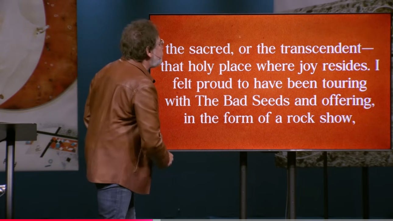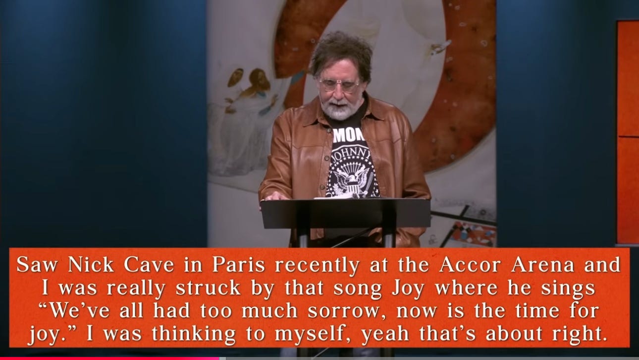 Zahnd introduces the song. He shares a bit of background and context—mentions Nick Cave losing his son in 2015. He talks about Bob Dylan seeing Nick Cave in Paris. “We’ve all had too much sorrow, now is the time for Joy. Yeah, that’s about right”, tweeted Dylan after seeing the show at the Accor Arena.