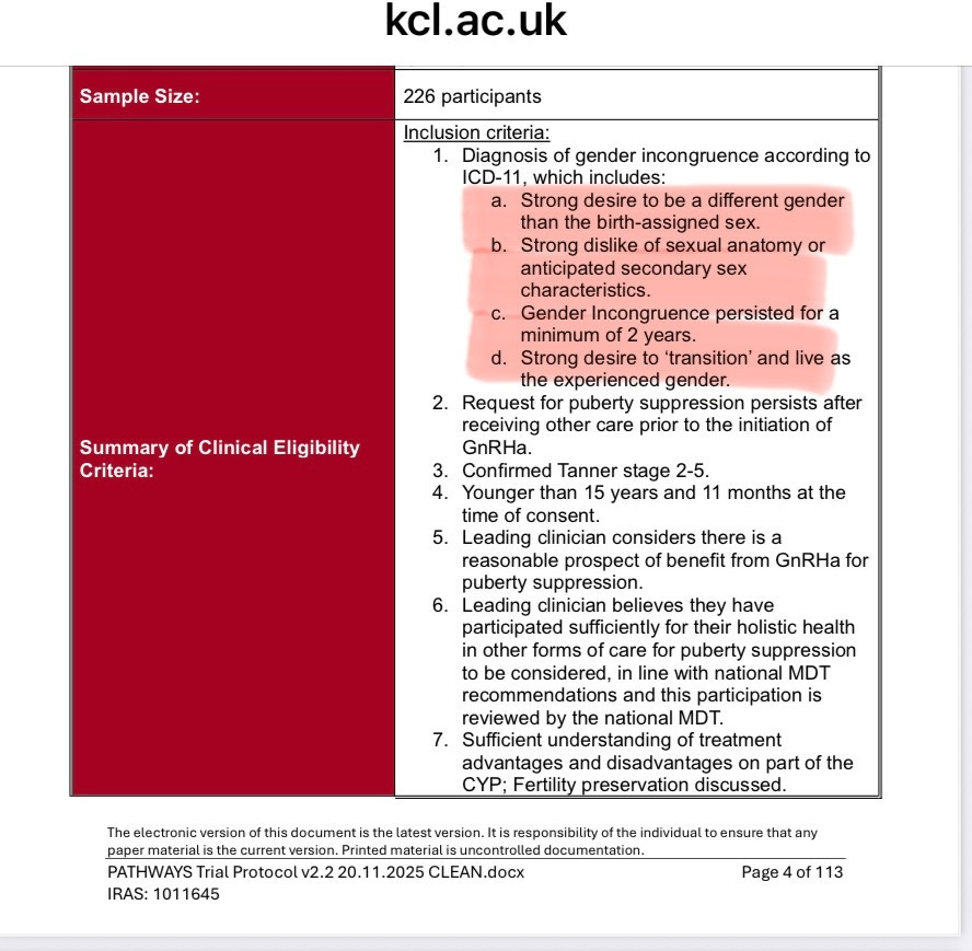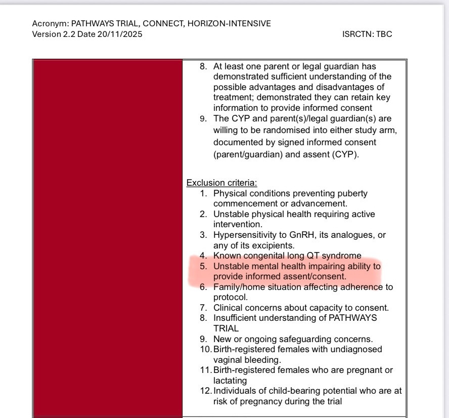 I’ll conclude with screenshots of the inclusion and exclusion criteria for the UK Lupron trial on gender dysphoric kids. It strikes me as having an unstable mental condition impairing consent when a child meets the diagnostic criteria for gender incongruence according to ICD-11. When a child expresses any of the following (below), they do indeed have an unstable mental health condition impairing their ability to provide informed assent/consent.
