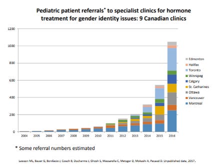 It began with the advent of SOGI. Numbers don’t lie, reader. Take a look. To understand this data it might help to know that Ontario introduced SOGI in 2015 and BC introduced it in 2016. We can easily surmise these numbers don’t tell the full story of demand for gender affirming care, because this data covers gender clinics and many young people don’t have access to gender clinics, they go to their paediatric or family doctor.