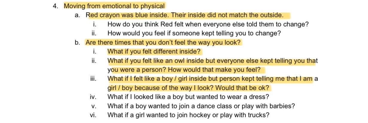 Above you can see a YouTube video of a reading aloud of the children’s story Red: A Crayon’s Story. Written for children aged 4 to 8 years old and labeled preschool grade level by Amazon, the book, tells the story of a blue crayon with a red label. BCTF features Red: A Crayon’s Story in gender lesson plan resources. The lesson plan targets grades K-3 and 4-7.