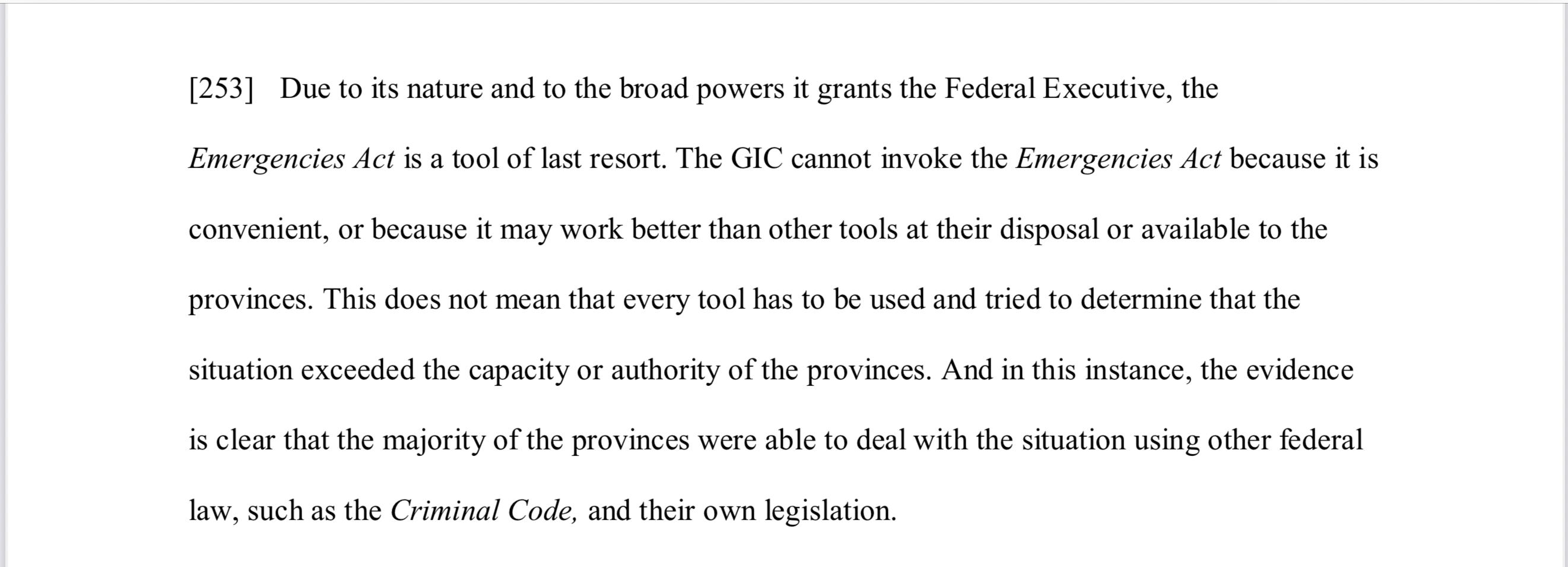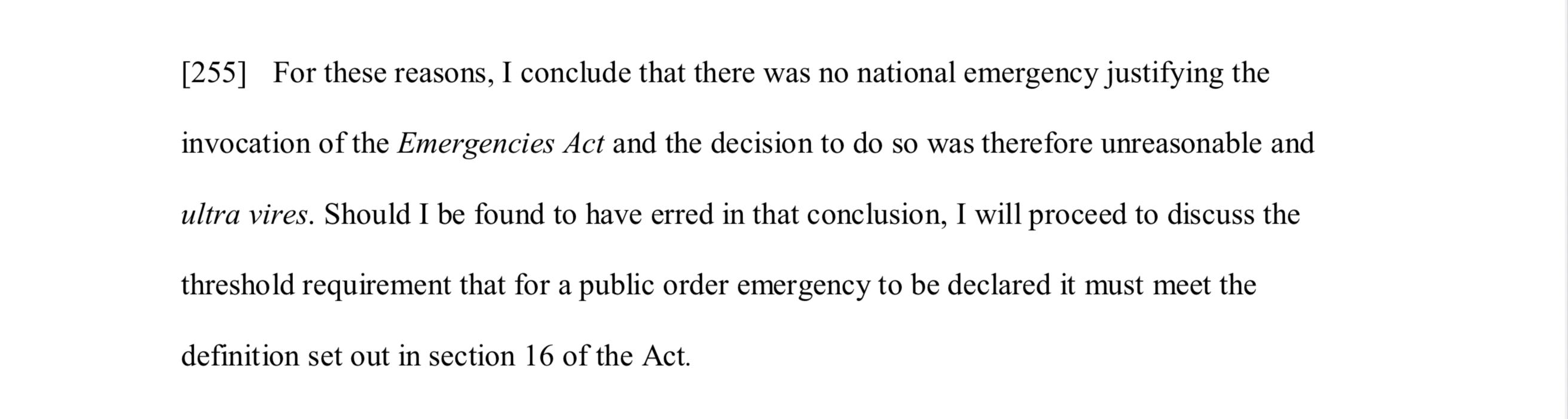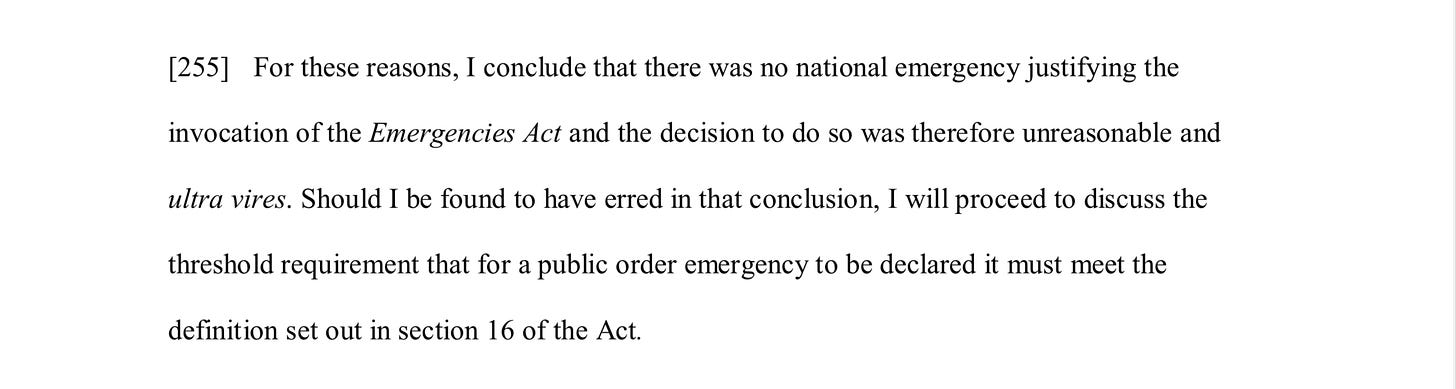 So, reader, that’s a serious violation the government committed in order to stop a protest that devolved into a mischievous occupation of downtown Ottawa. It became a city-wide emergency for Ottawa. The province of Ontario declared an emergency. It wasn’t a national emergency though.