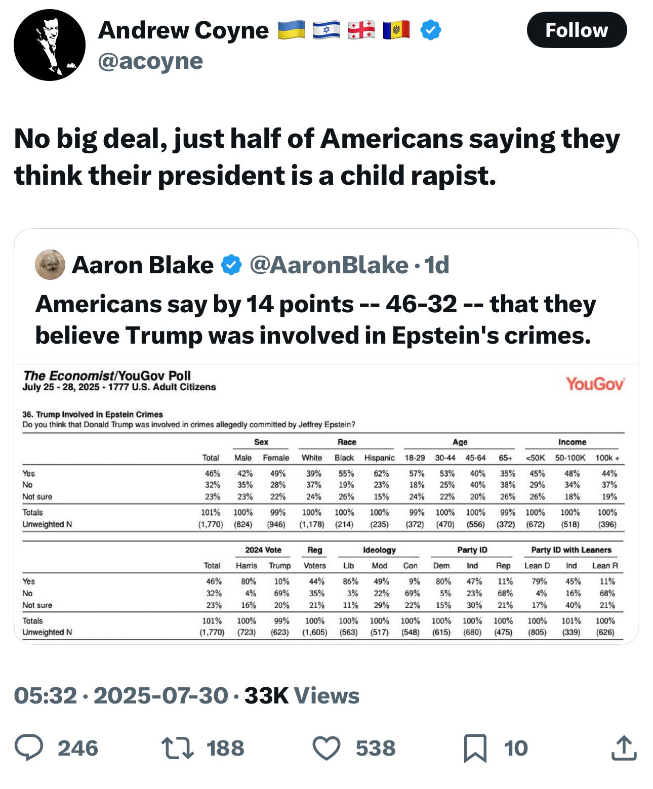 You know, it may well be that many well known and powerful people dabbled in Epstein and Maxwell’s enterprise of offering young girls for entertainment etc etc purposes. I don’t doubt that for a minute. That’s how high society works, always has done, too. It’s nothing new. I don’t know anything about direct evidence linking Trump to committing any crimes of the Epstein variety.