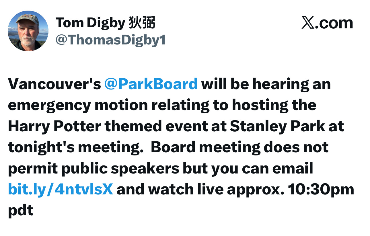 “By in-camera decision dated May 12, 2025, the Park Board approved hosting a Harry Potter™ event in Stanley Park, with that event being currently scheduled to open in November 2025, which approval may not have had a robust reputational assessment at that time about its impact on the TGD2S community.”