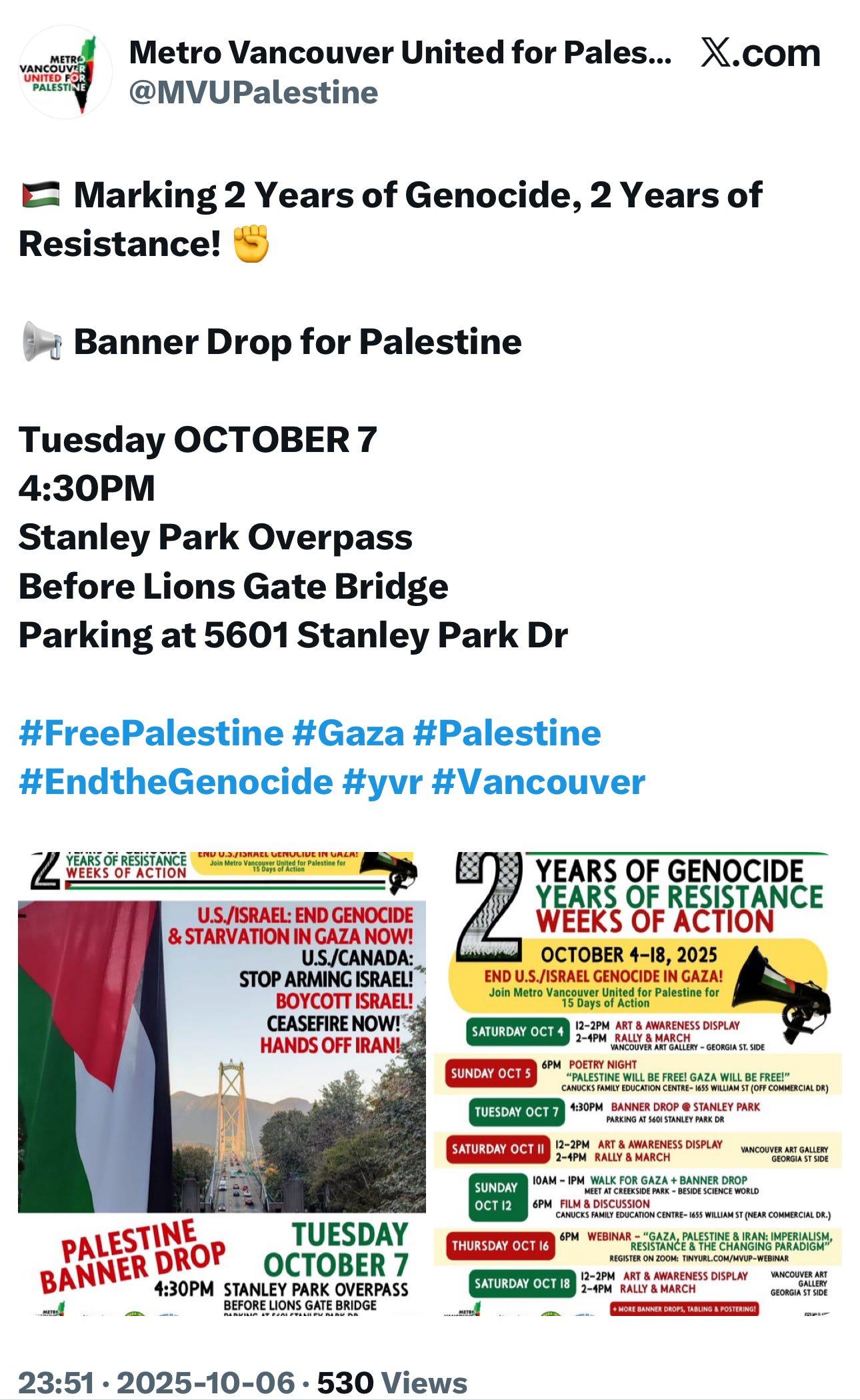 On the second anniversary of the October 7th massacre, antisemitic activists held Banner Drop at Stanley Park, as part of the “week of action for Palestine.” The event marks “2 years of genocide.” That’s literally blood libellous event, it’s antisemitism happening in Stanley Park. Reader, Canadians were killed in that massacre, one perpetrated by Palestinians. Though we shouldn’t only mourn the massacre and torture and kidnapping of Canadians— anyone who saw the attack snuff videos knows the horror of the carnage that happened that day in 2023.