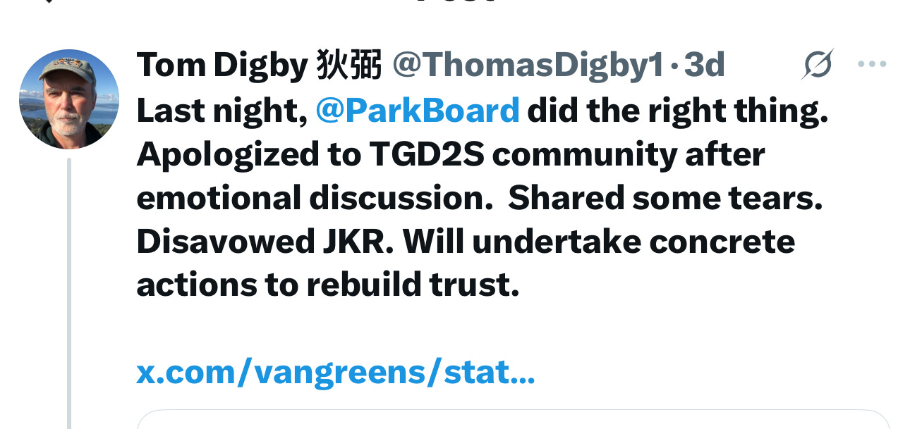 So, I’m not sure what’s Tom Digby’s problem. He and his Park Board colleagues cried and then disavowed JK Rowling? Really? Can they maybe grow some thicker skin?