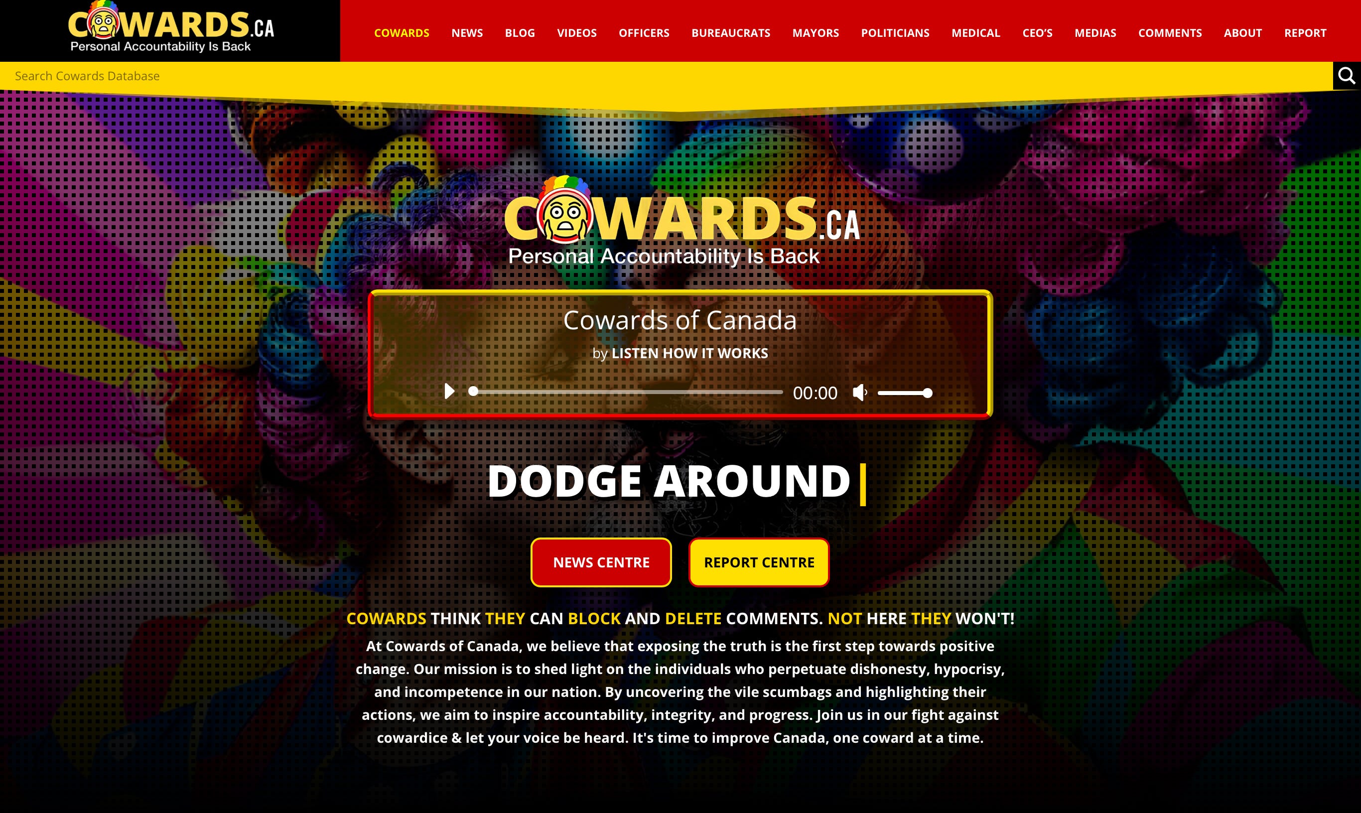Welcome to Cowards of Canada, a platform dedicated to fearlessly exposing the truth and ensuring unwavering accountability for individuals who engage in corrupt and deceitful practices. Our relentless dedication, combined with the power of our fellow citizens, has successfully held these individuals accountable for their cowardly behavior, leaving no room for them to hide from the consequences of their actions. We are committed to unearthing the dark secrets that plague our society and shining a bright spotlight on their cowardly actions.