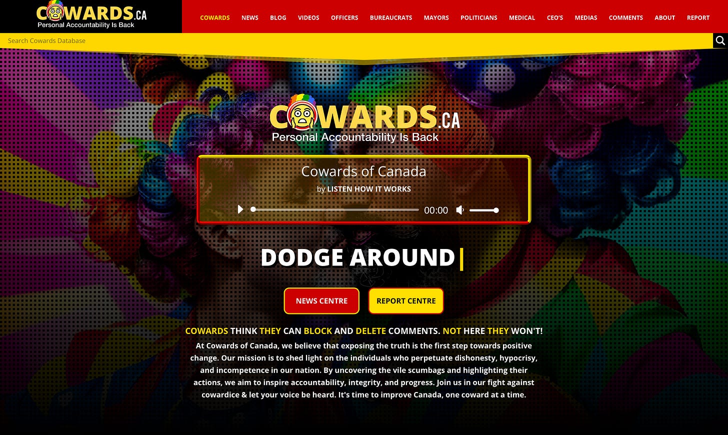 “At Cowards of Canada, we believe that exposing the truth is the first step towards positive change. Our mission is to shed light on the individuals who perpetuate dishonesty, hypocrisy, and incompetence in our nation. By uncovering the vile scumbags and highlighting their actions, we aim to inspire accountability, integrity, and progress. Join us in our fight against cowardice & let your voice be heard. It's time to improve Canada, one coward at a time.”