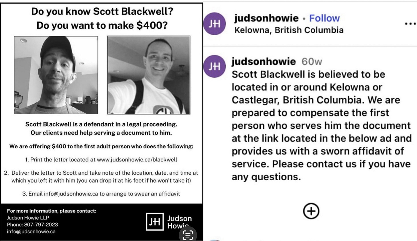Judson also ran an ad on the Judson Howie website and on social media offering a $400 reward to anyone who could help him find the defendant in order to serve him a legal document related to the defamation case. The ad no longer appears on the Judson Howie website as far as I can see, and the firm has locked its X account so I’m unable to independently verify the screenshot of either the ad or the social media post which I found on X. The letter of service remains on the Judson Howie website at the time of this writing, and I’ve archived it here. Readers can see my source for the screenshots by searching “Peter Scott Blackwell” on X.