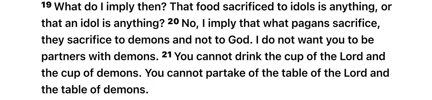“Therefore, my beloved, flee from the worship of idols…You cannot drink the cup of the Lord and the cup of demons…[do not partake] out of consideration for the one who informed you [of the idolatry involved] and for the sake of conscience-I mean the other’s conscience, not your own…So, whether you eat or drink or whatever y…