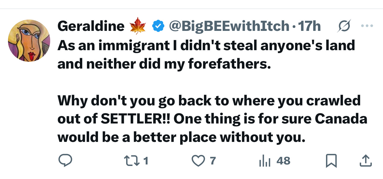 Canada, I think you are not okay. As an epilogue to the story, here’s Geraldine bristling at Sharan Kaur deploying the settler colonial construct in discourse with her fellow Canadians.