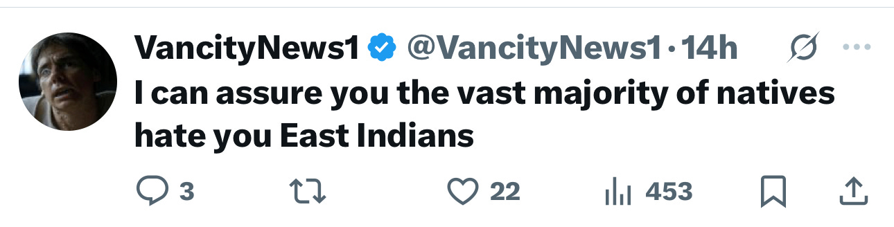 Vancity News 1 points out that indigenous people are fairly xenophobic and don’t like Indians (that is, people from India). Yes, Vancity News 1 absolutely has it right in reminding us of the humanity of indigenous people—they’re subject to the psychological phenomena known as racialisation and dehumanisation, like the rest of us humans.